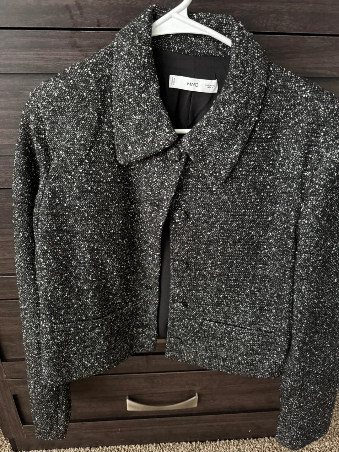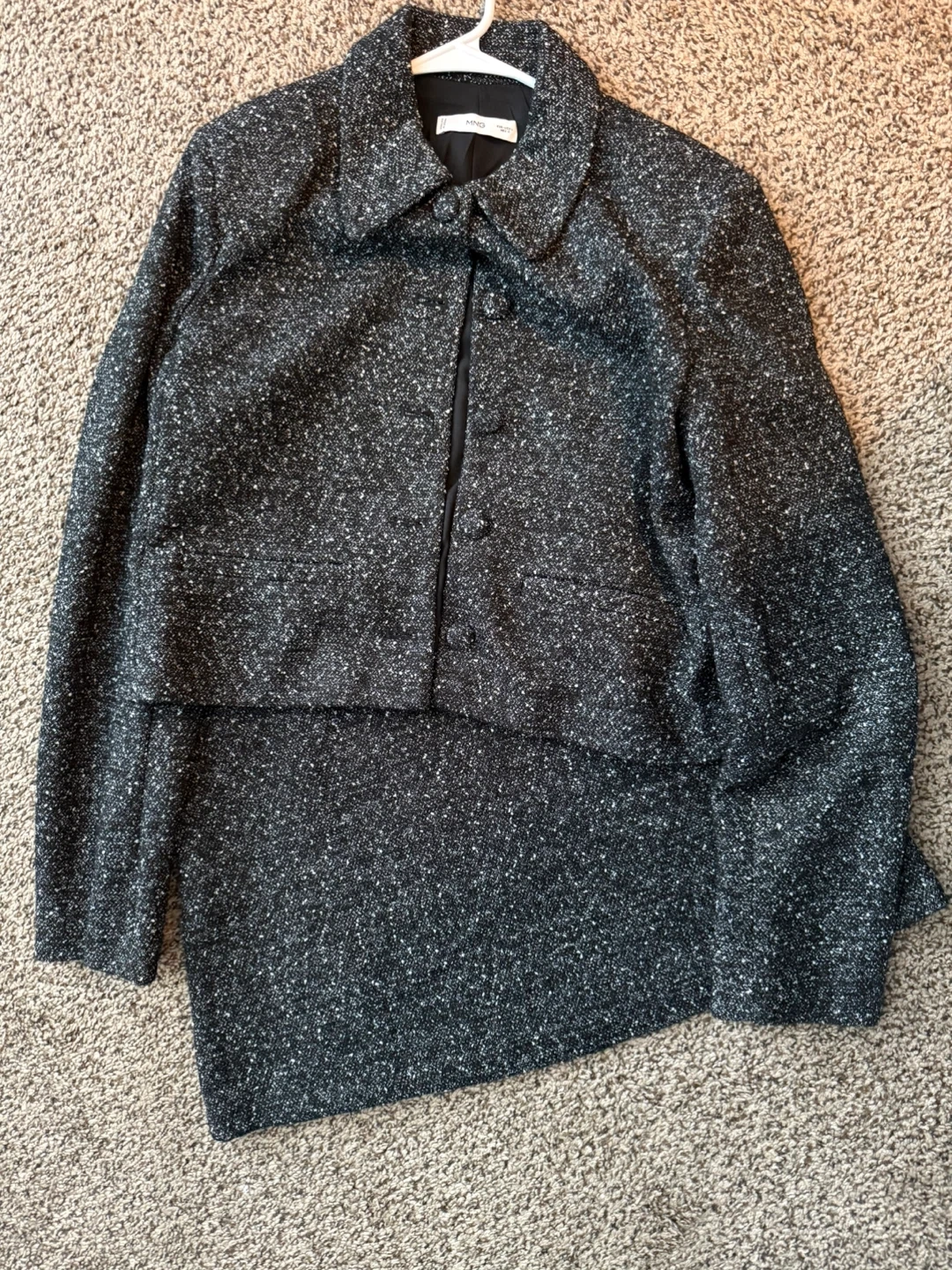 Selling a cute tweed jacket and skirt set from MNG (Mango). Both pieces are a size large and in great condition. The jacket is a cropped style with a collared neckline, and the skirt is a simple A-line shape. Perfect for a chic and put-together look! Vendo un bonito conjunto de chaqueta y falda de tweed de MNG (Mango). Ambas piezas son una talla grande y están en excelentes condiciones. La chaqueta es un estilo recortado con un escote de cuello, y la falda tiene una forma de línea A simple. ¡Perfecto para un look elegante y arreglado!