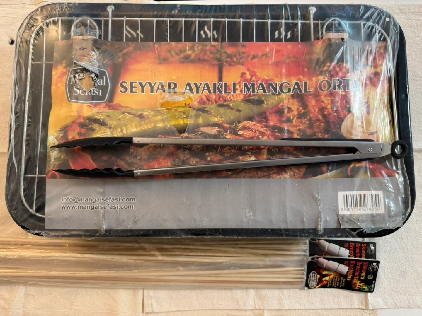 Selling a Seyyar Ayakli Mangal Orta grill, complete with skewers and tongs! It's ready for your next BBQ. Perfect for grilling up your favourite foods outdoors.