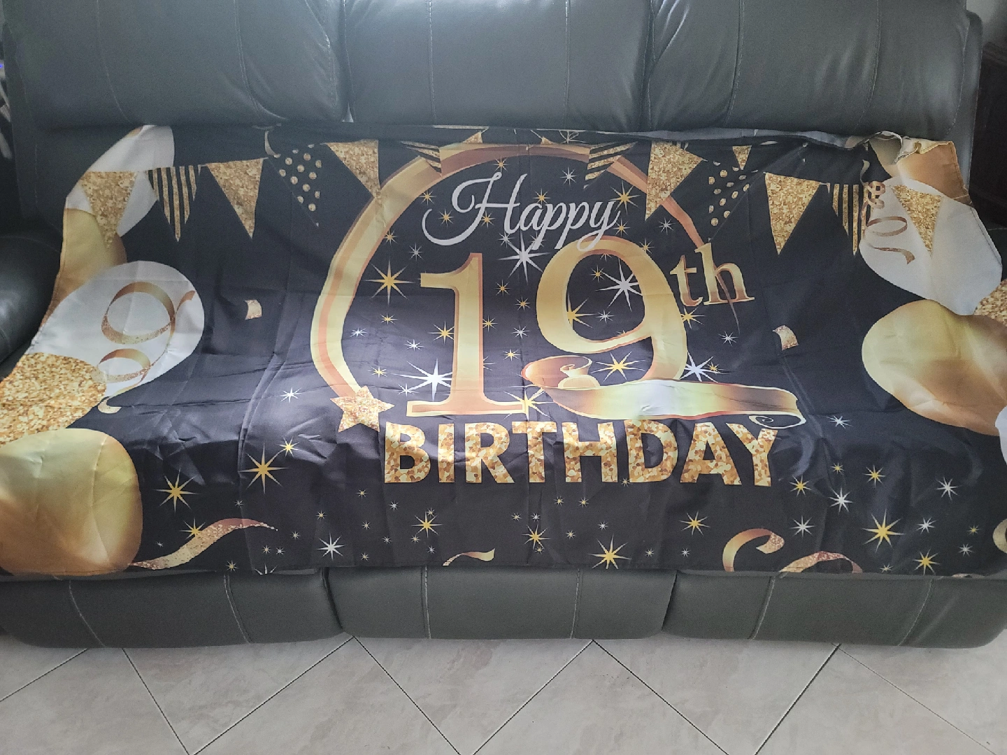 18Selling a "Happy 19th Birthday" banner! It features a black background with gold accents, including stars, balloons, and confetti. Perfect for a 19th birthday celebration pick up in Merrick Ny CASH ONLY