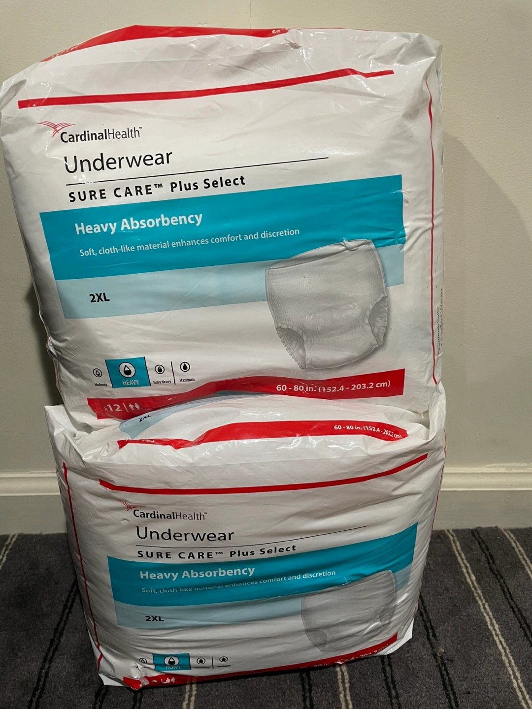 Selling a package of Cardinal Health Sure Care Plus Select underwear in size 2XL. These offer heavy absorbency and are made with a soft, cloth-like material for comfort and discretion. Fits 60-80 in. (152.4 - 203.2 cm)