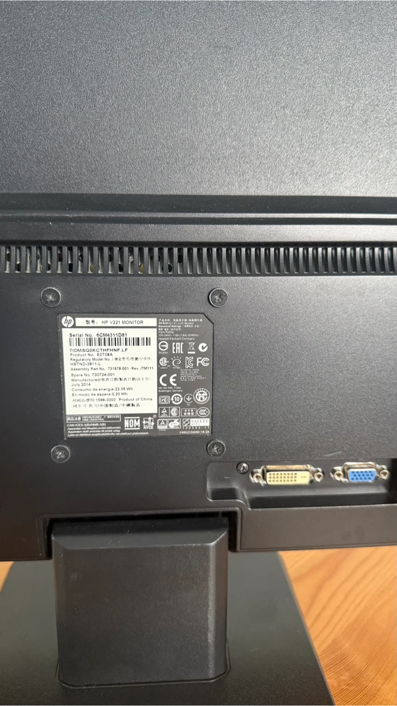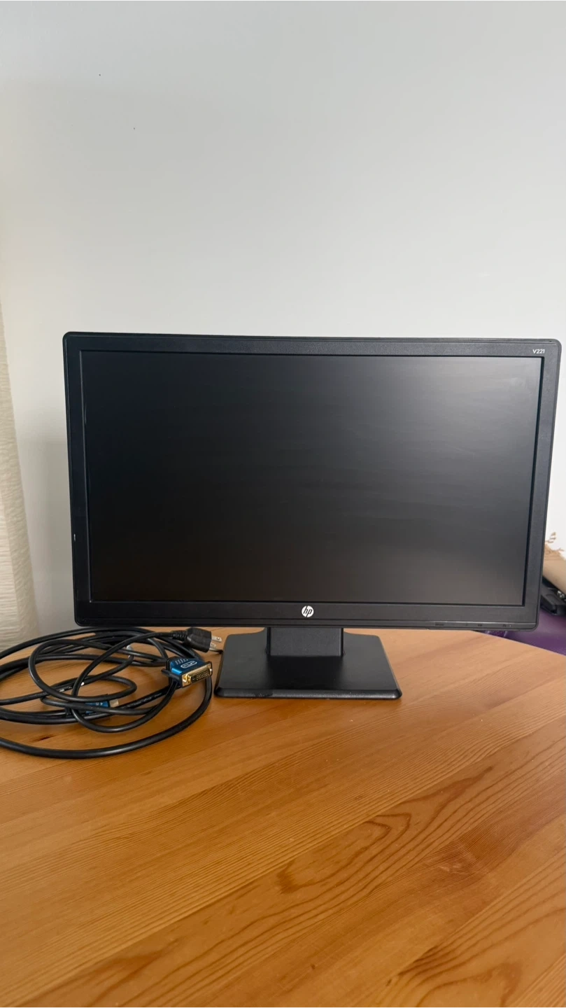 Brand: HP Screen Size: 21.5 in MPN: V221 Model: HP V221 Video Inputs: DVI, VGA UPC: Does Not Apply Type: LCD Monitor Comes with both cables.