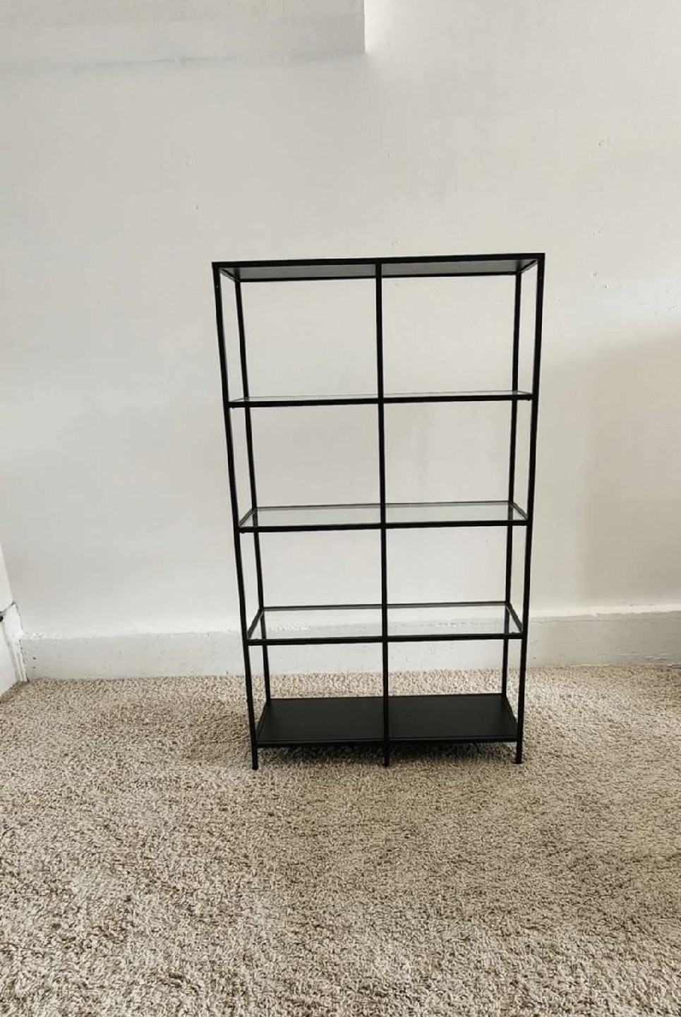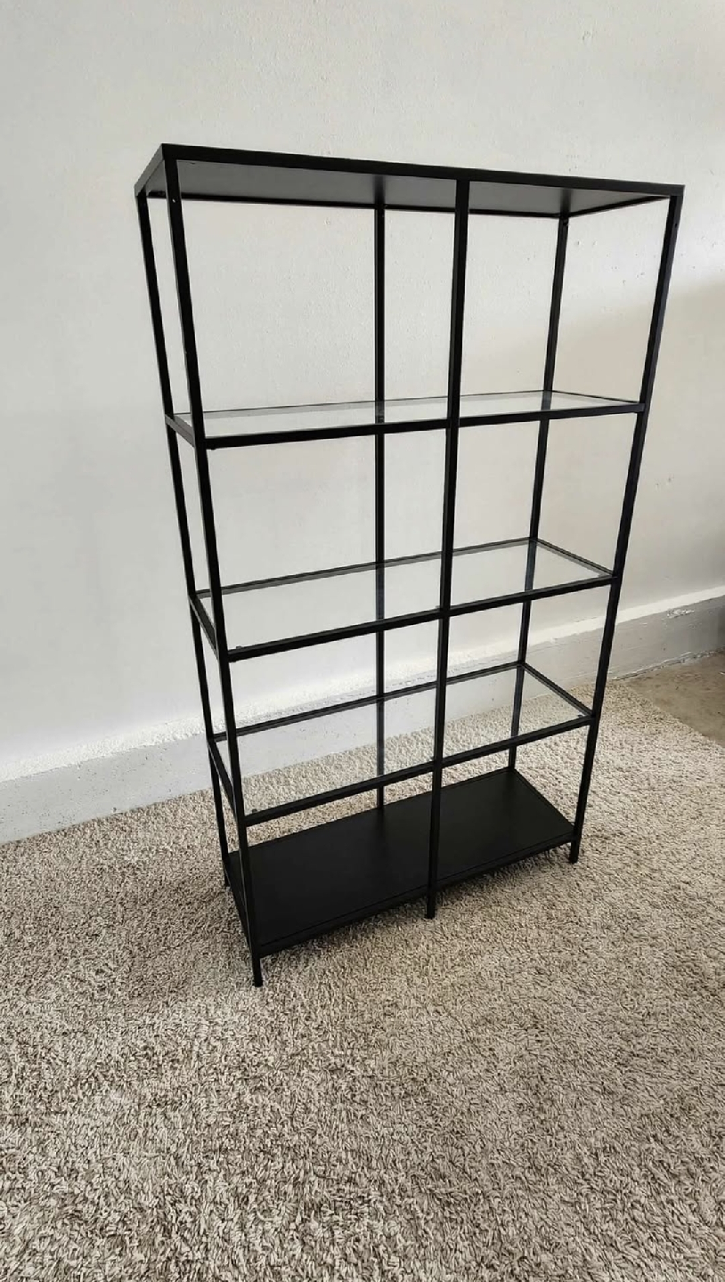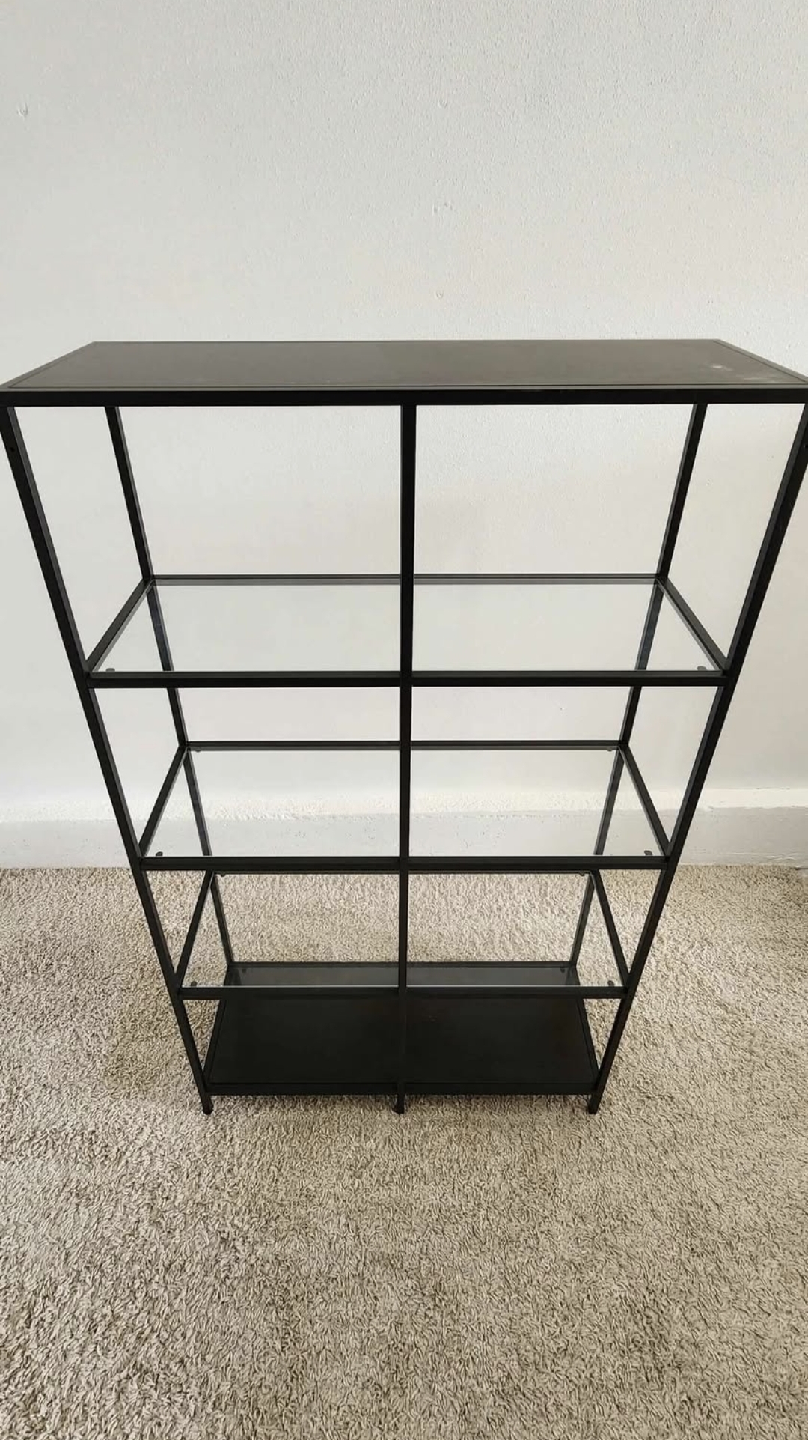 Selling our bookshelf. It has glass and wooden shelves and is in excellent condition. The dimensions are 40" x 69" x 14.5".