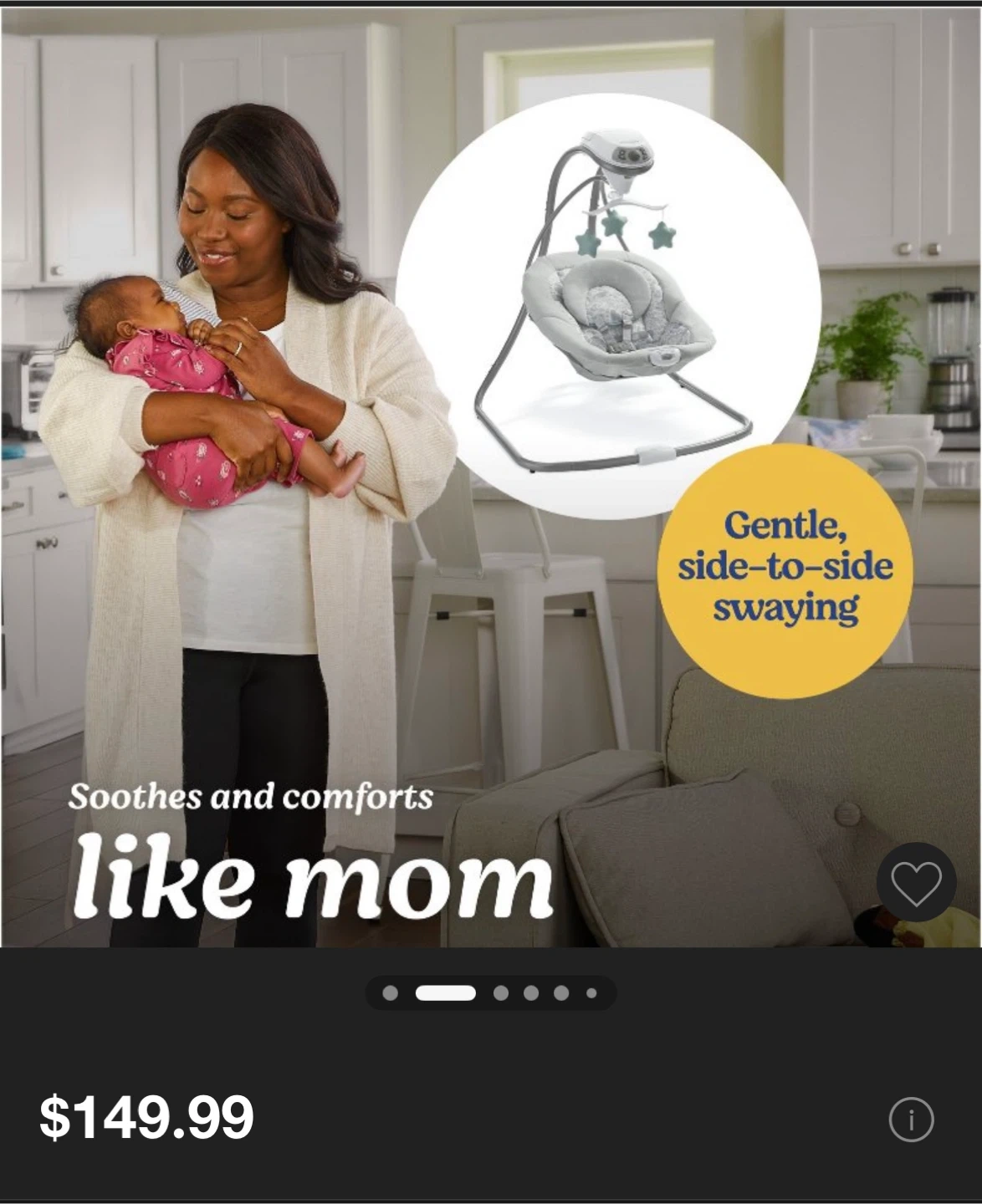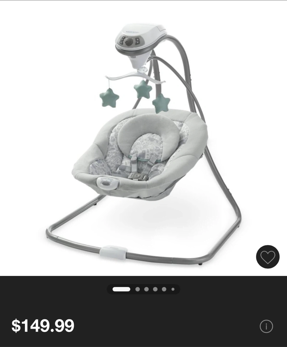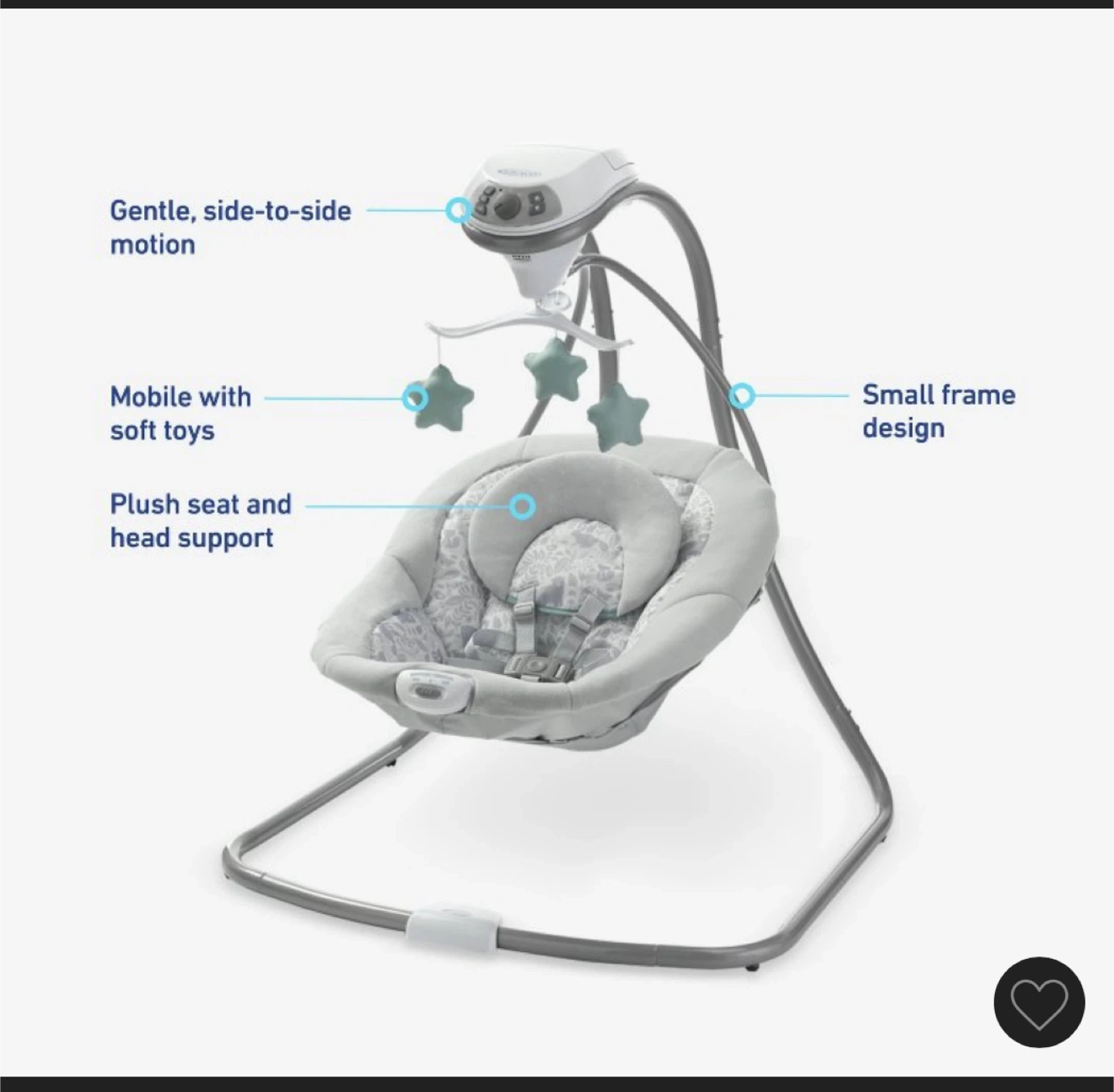 This is a Graco Simple Sway Baby Swing in gray. It is in excellent condition, everything works perfectly. It features gentle, side-to-side motion, soft toys, and a plush seat with head support. The swing is mobile with its small frame design. Originally bought for $149.99.