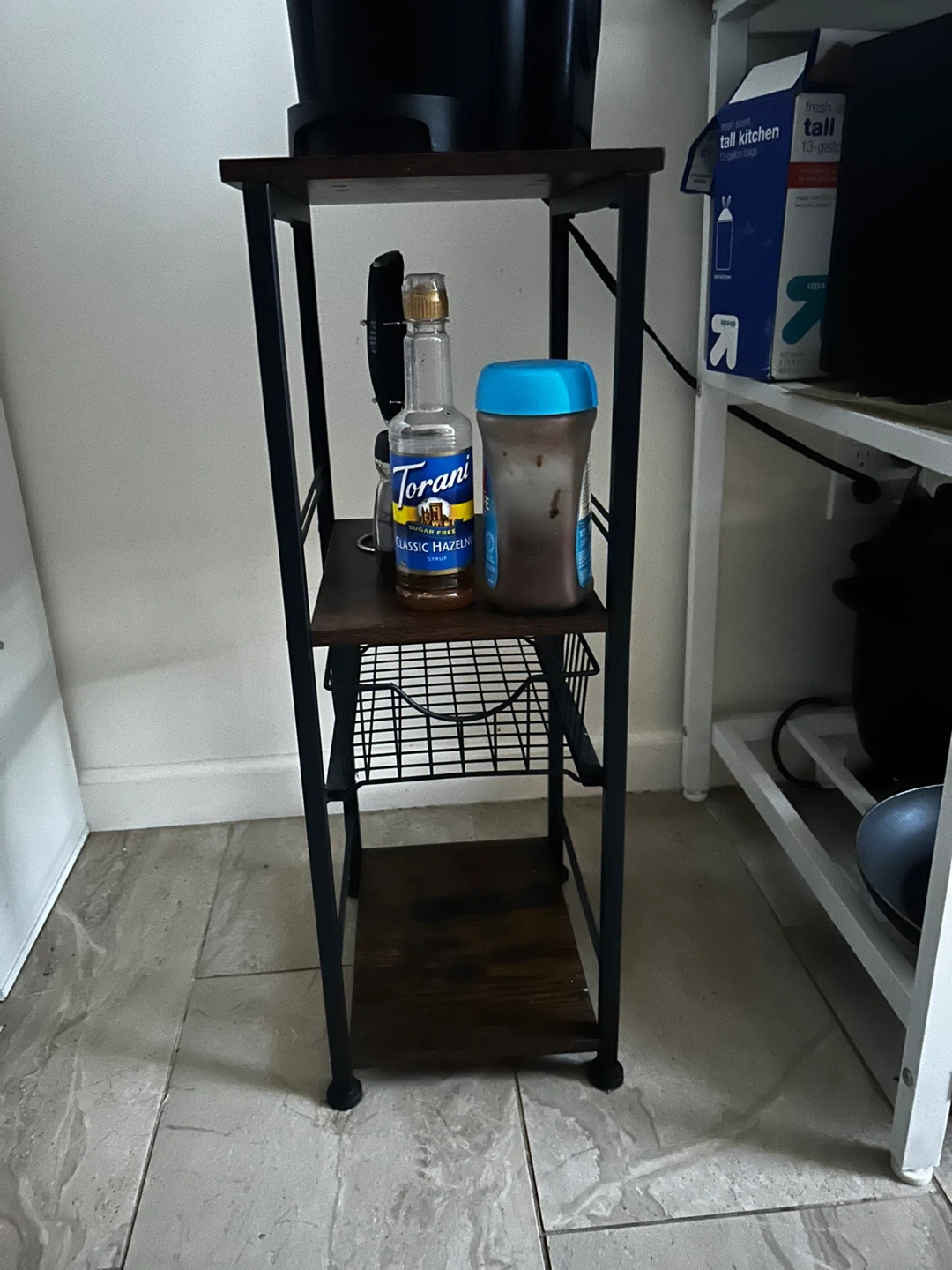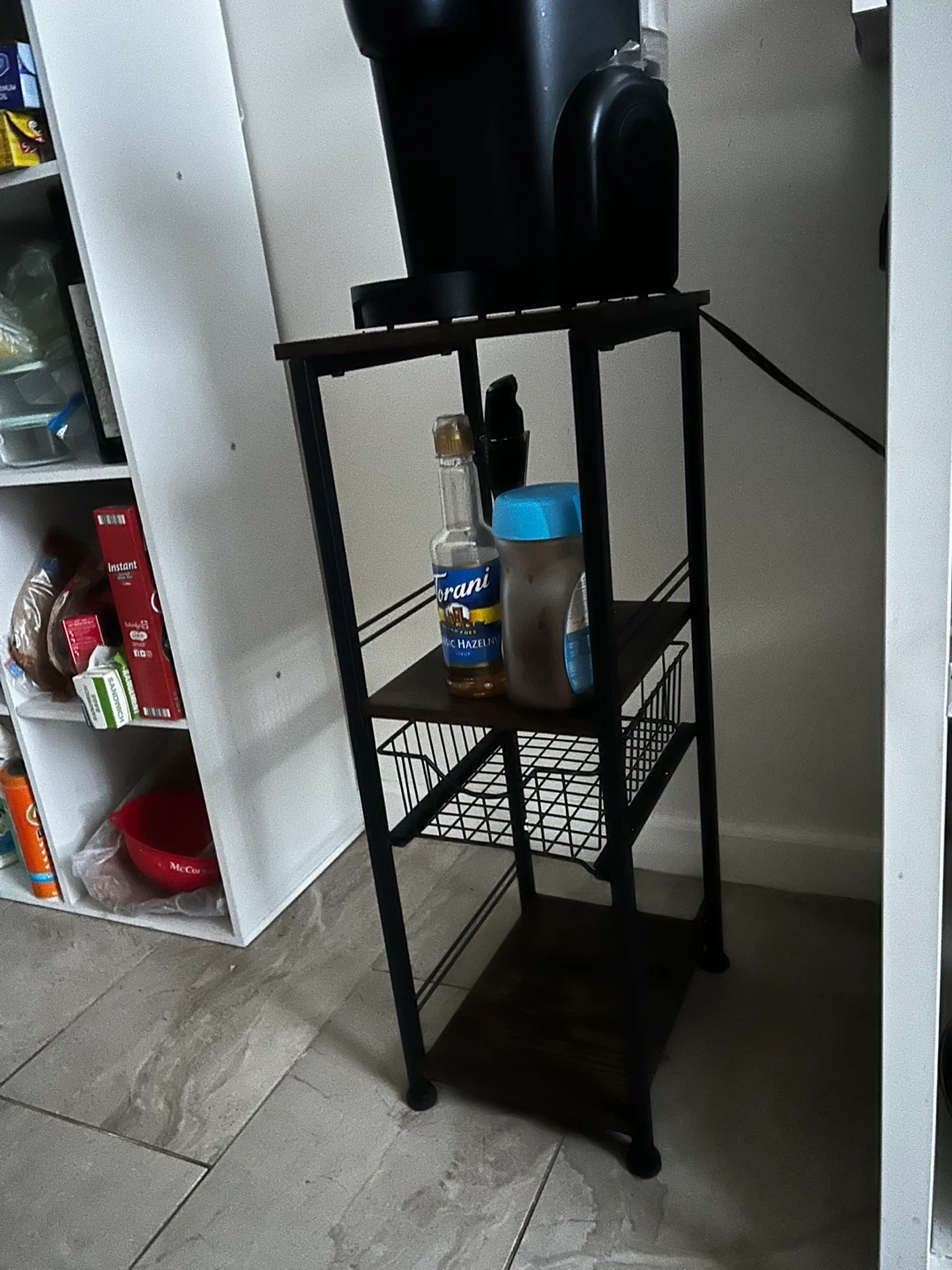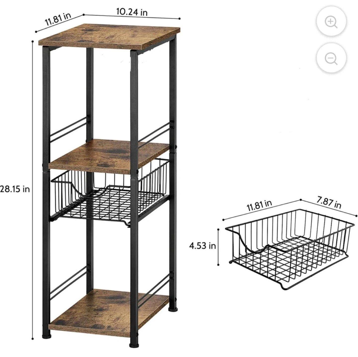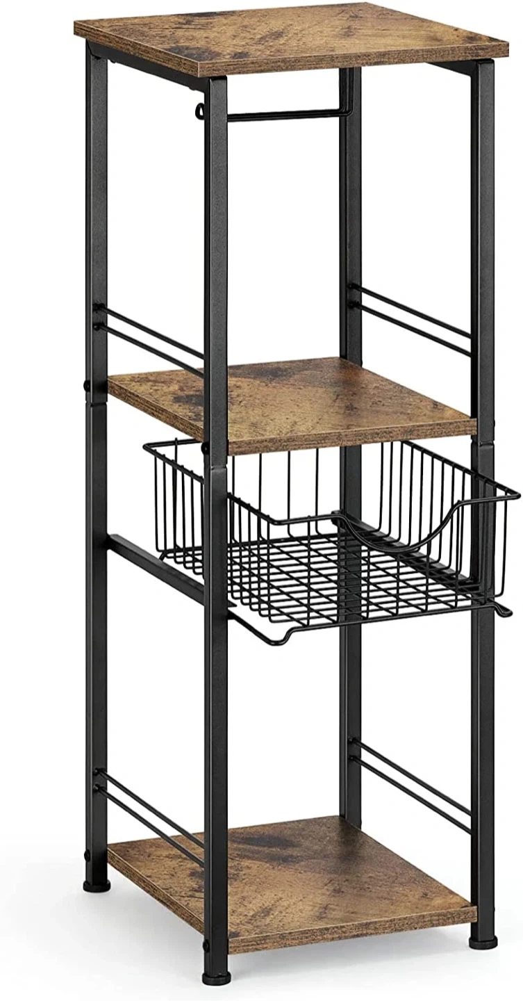 This is a 3-tier kitchen baker's rack shelf. It features a metal frame with wooden shelves and a wire basket. The dimensions are approximately 11.81 inches wide, 10.24 inches deep, and 28.15 inches high