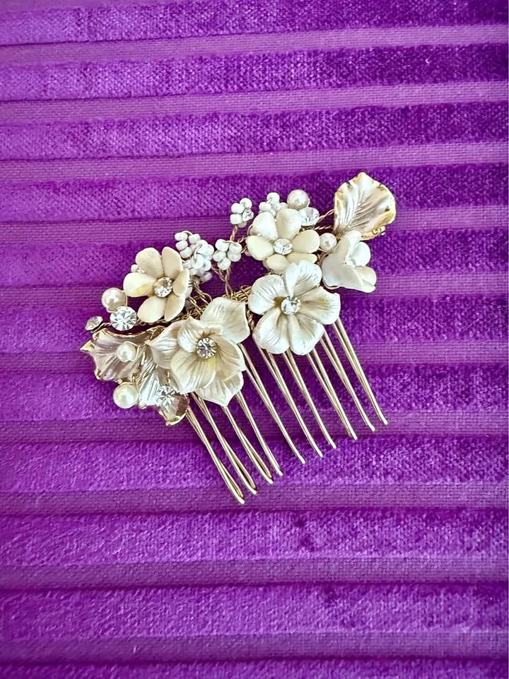 Elegant hair comb with cream flowers and sparkling accents. Perfect for special occasions. Brand new Anthropologie BHLDN Pearl, Beads & Crystal Comb. Beautiful hair accessory. Never been used. So elegant & chic. Add a touch of elegance to your hair with this Anthropologie BHLDN Comb. The beautiful hair accessory features a stunning combination of pearls, beads and crystals that will surely complement any bridal look. The silver comb is perfect for holding up any hairstyle, and the materials used to create the comb are of high quality. This hair comb is perfect for any formal occasion and is an excellent addition to any bridal accessories collection. Made in the USA ⚪️ There is a tiny crack which is not visible at all, shown on the last photo.