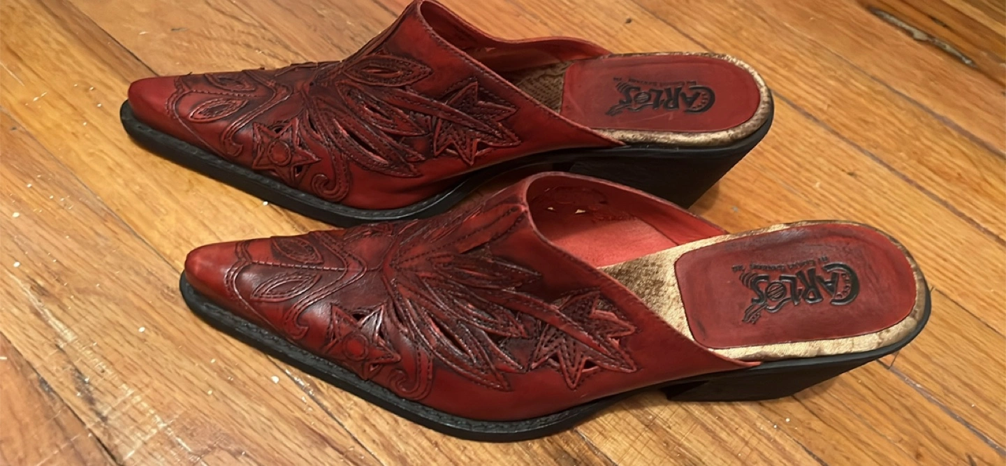 15These are a pair of Carlos Santana mules in size 6. They are a beautiful red leather with a unique design. Perfect for adding a pop of color and style to your wardrobe!