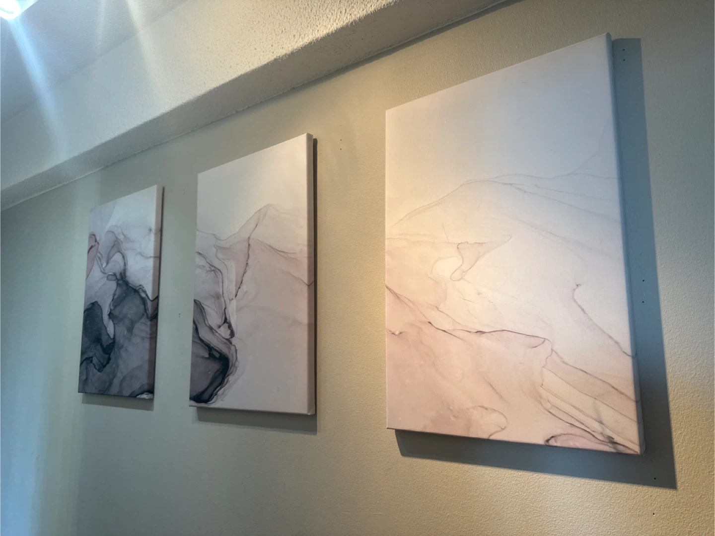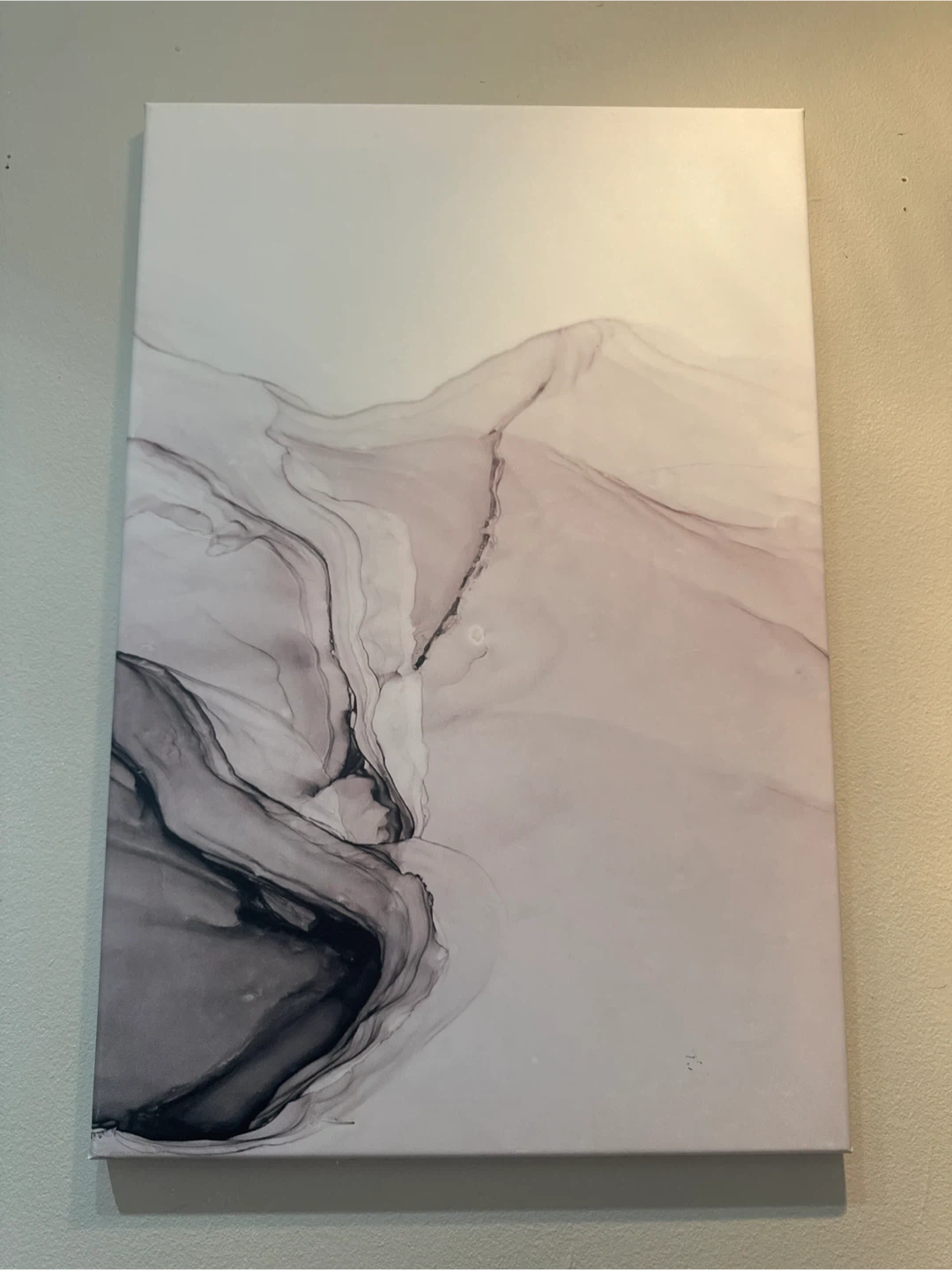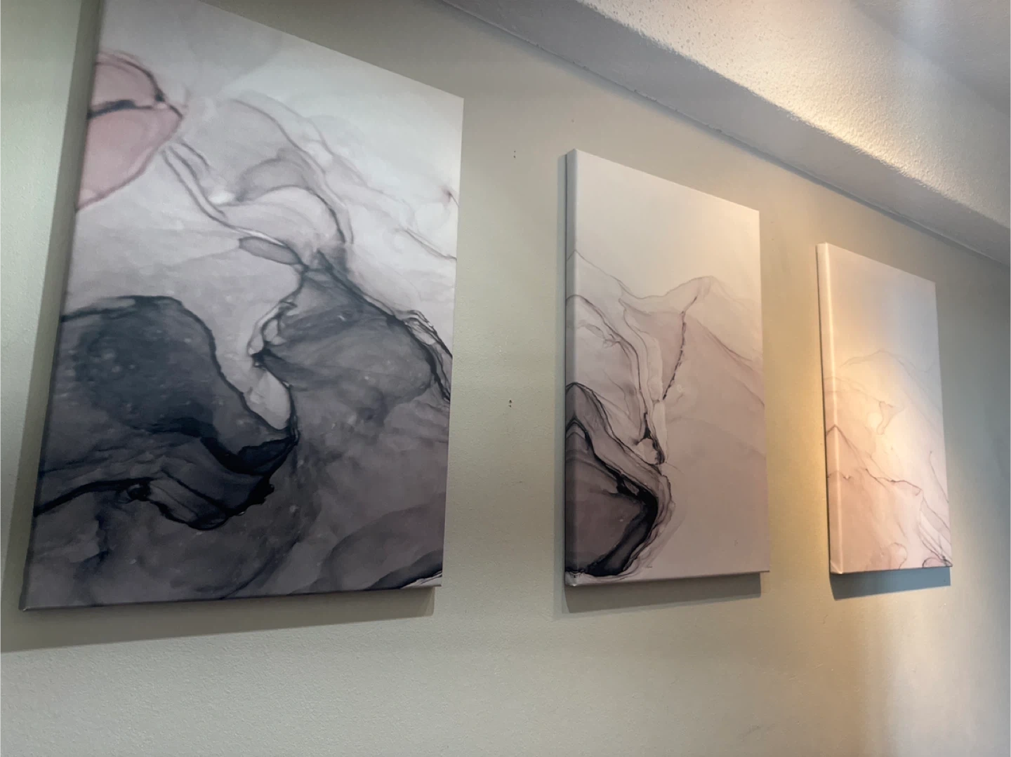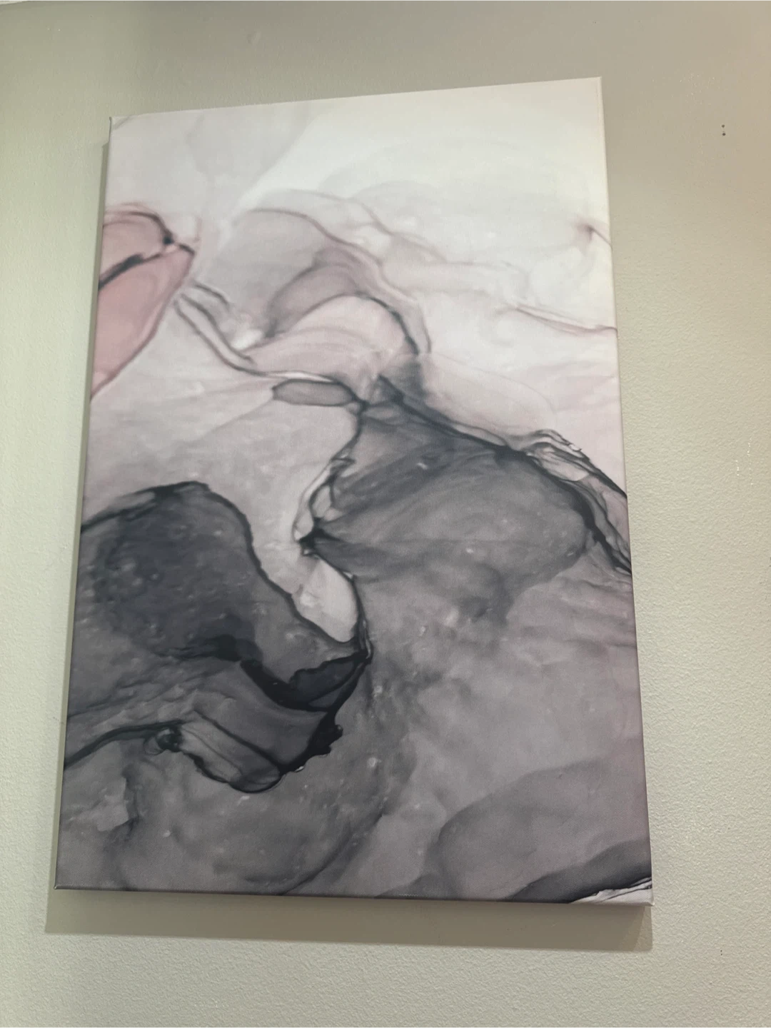 73Selling a set of three abstract canvas wall art pieces. They feature a beautiful blend of gray, white, and pink hues, creating a calming and modern aesthetic for any room. Perfect for adding a touch of elegance to your home decor