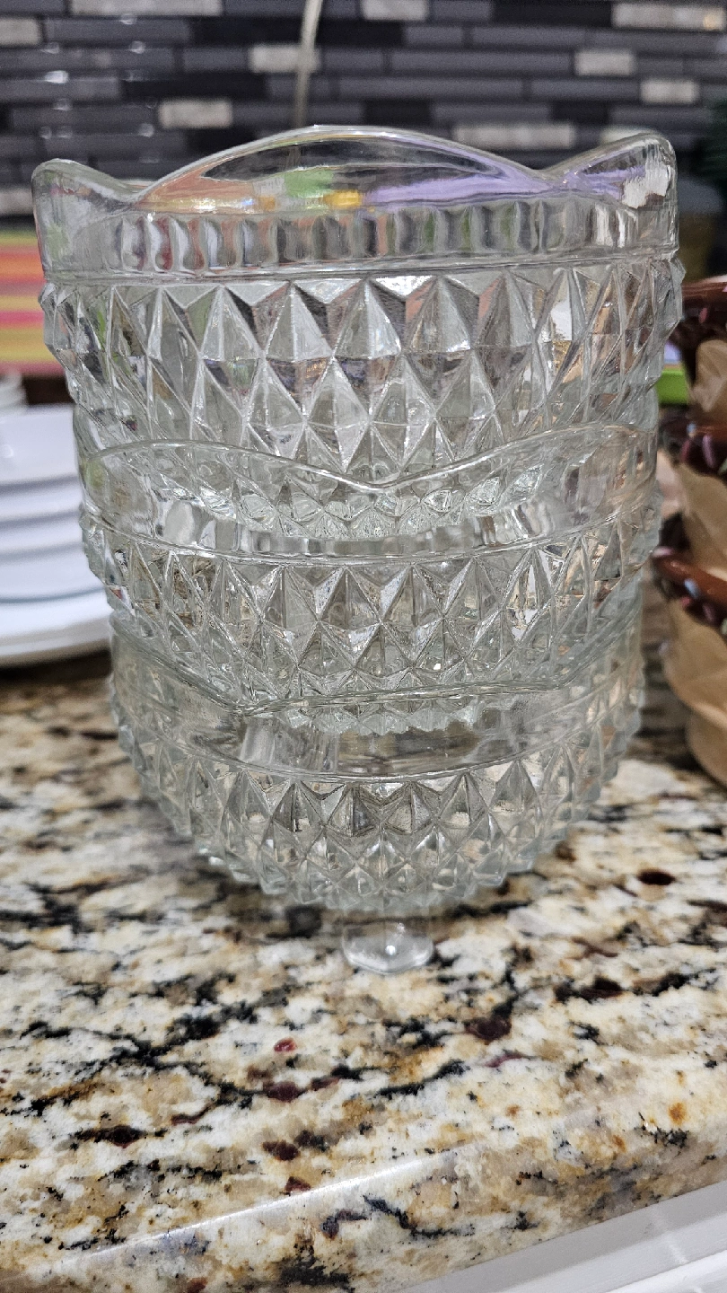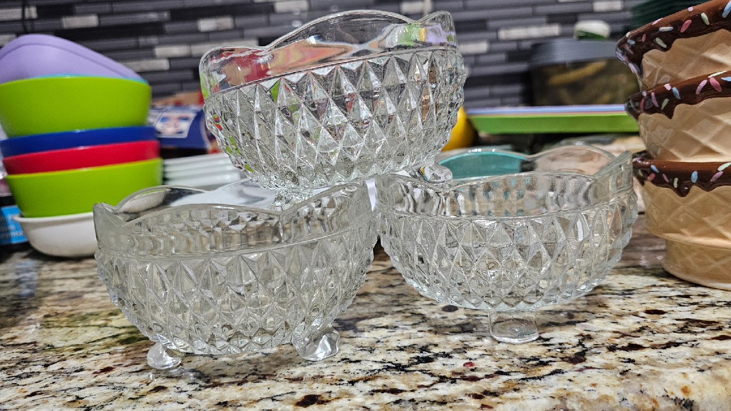 97Set of 3. INDIANA GLASS DIAMOND POINT CRYSTAL 3 FOOTED BOWL ~ VINTAGE SCALLOPED EDGE AT TOP EXCELLENT PREOWNED CONDITION CRYSTAL CLEAR 3 INCHES HEIGHT ~ 5 INCHES WIDTH $10 obo