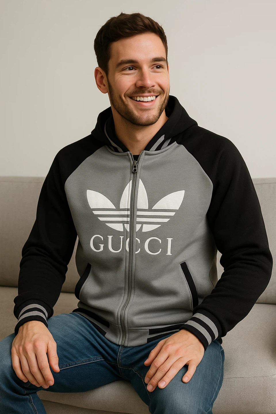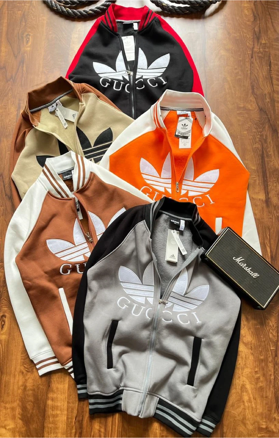 82Selling an Adidas x Gucci zip-up jacket. It features the Adidas logo combined with Gucci lettering. Available in multiple colors and sizes. M, L, XL Great for casual wear or athletic activities!
