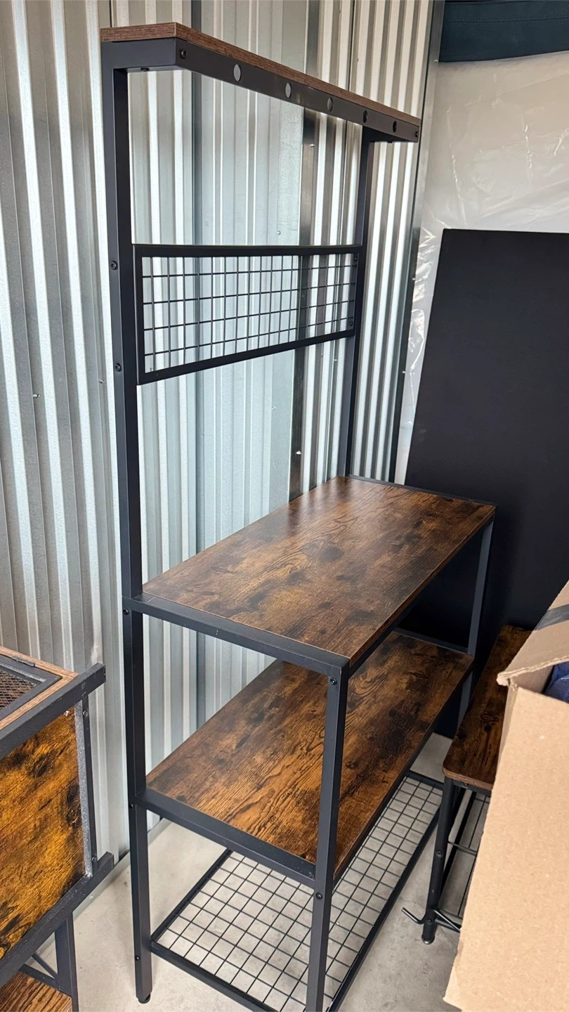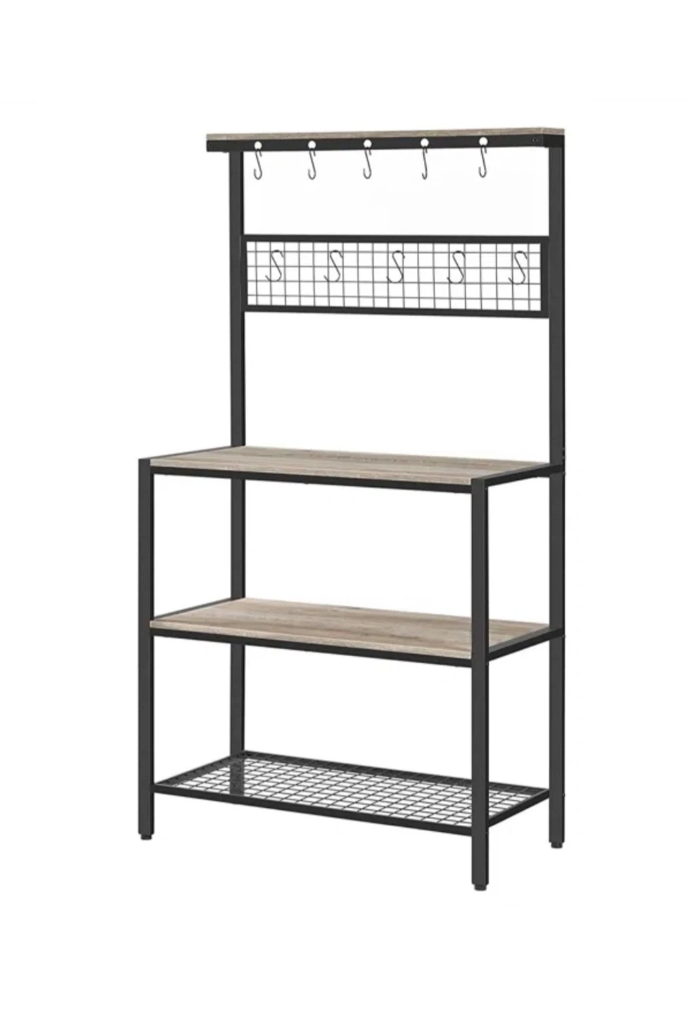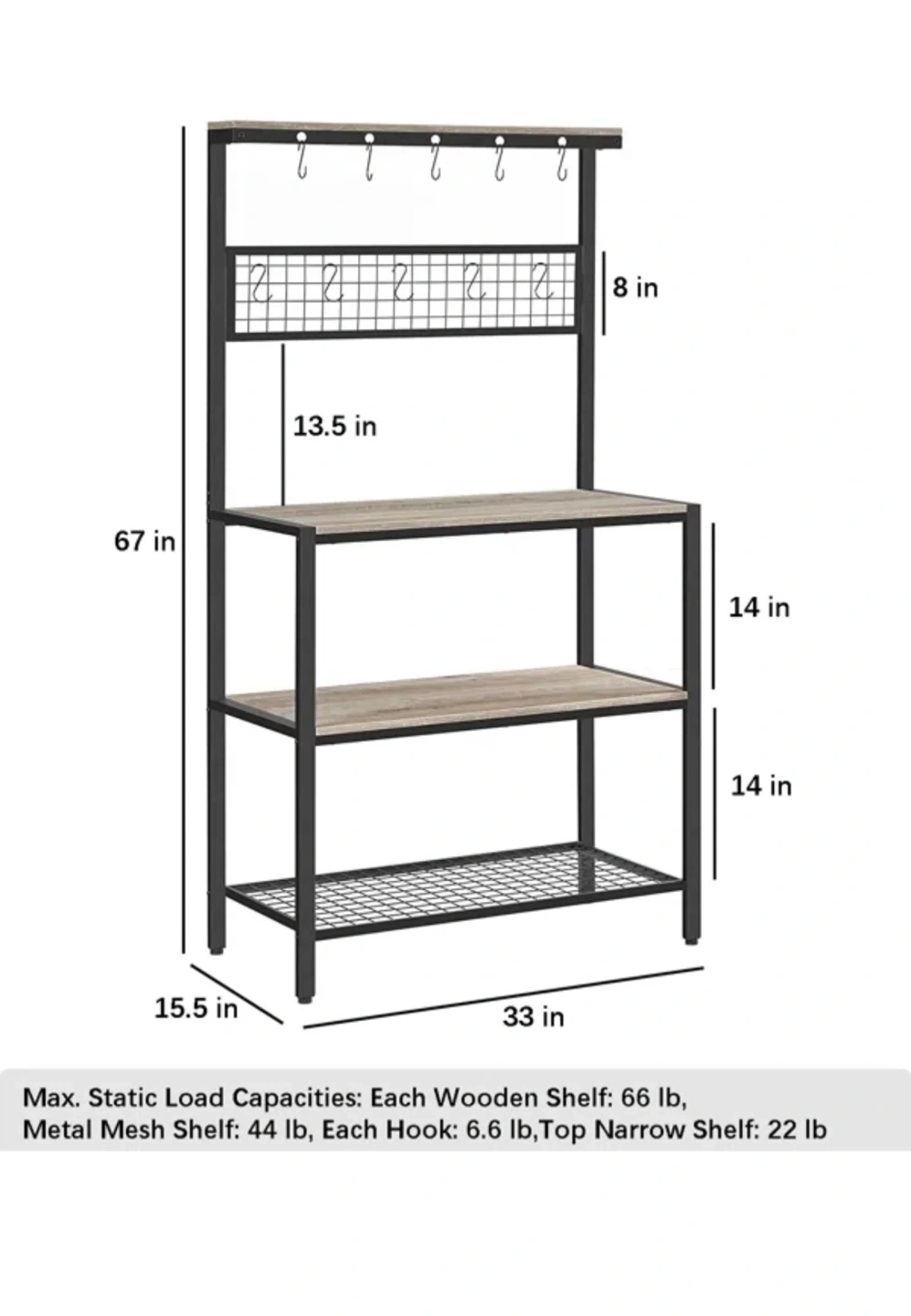 Perfect condition, Pick up in Astoria (storage) From: Wayfair.com This baker's rack features a wooden top and two shelves, along with a metal mesh shelf for extra storage. It also has adjustable footpads to protect your floor and enhance stability. The dimensions are 67 inches tall, 33 inches wide, and 15.5 inches deep. Each wooden shelf can hold up to 66 lbs, while the metal mesh shelf can hold 44 lbs