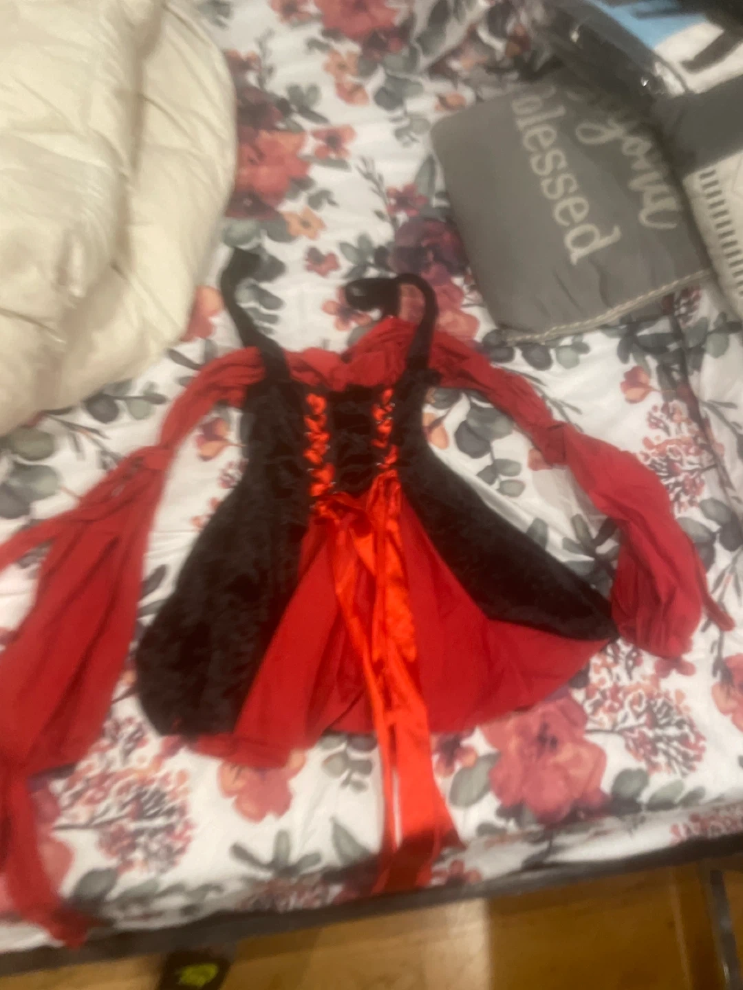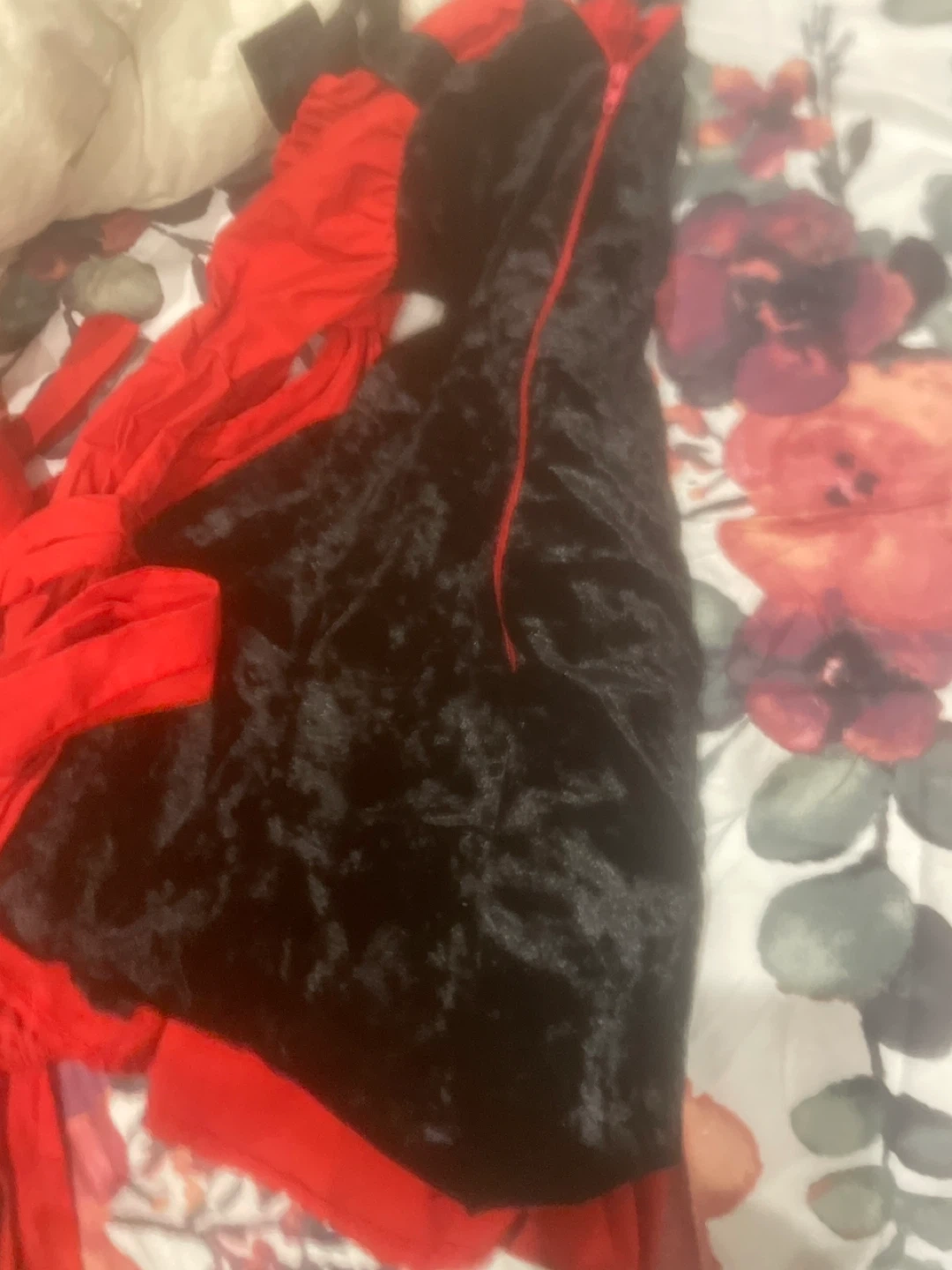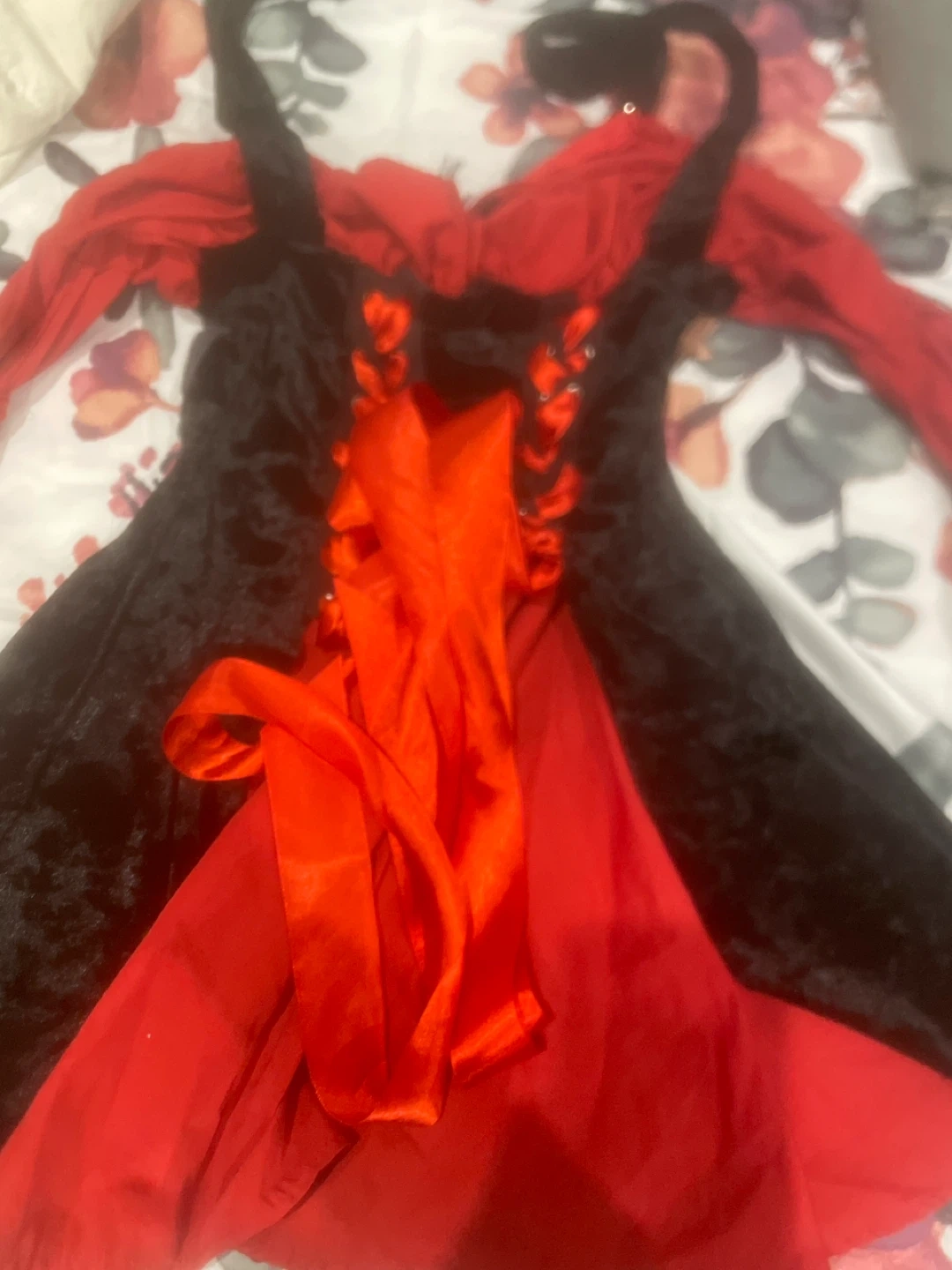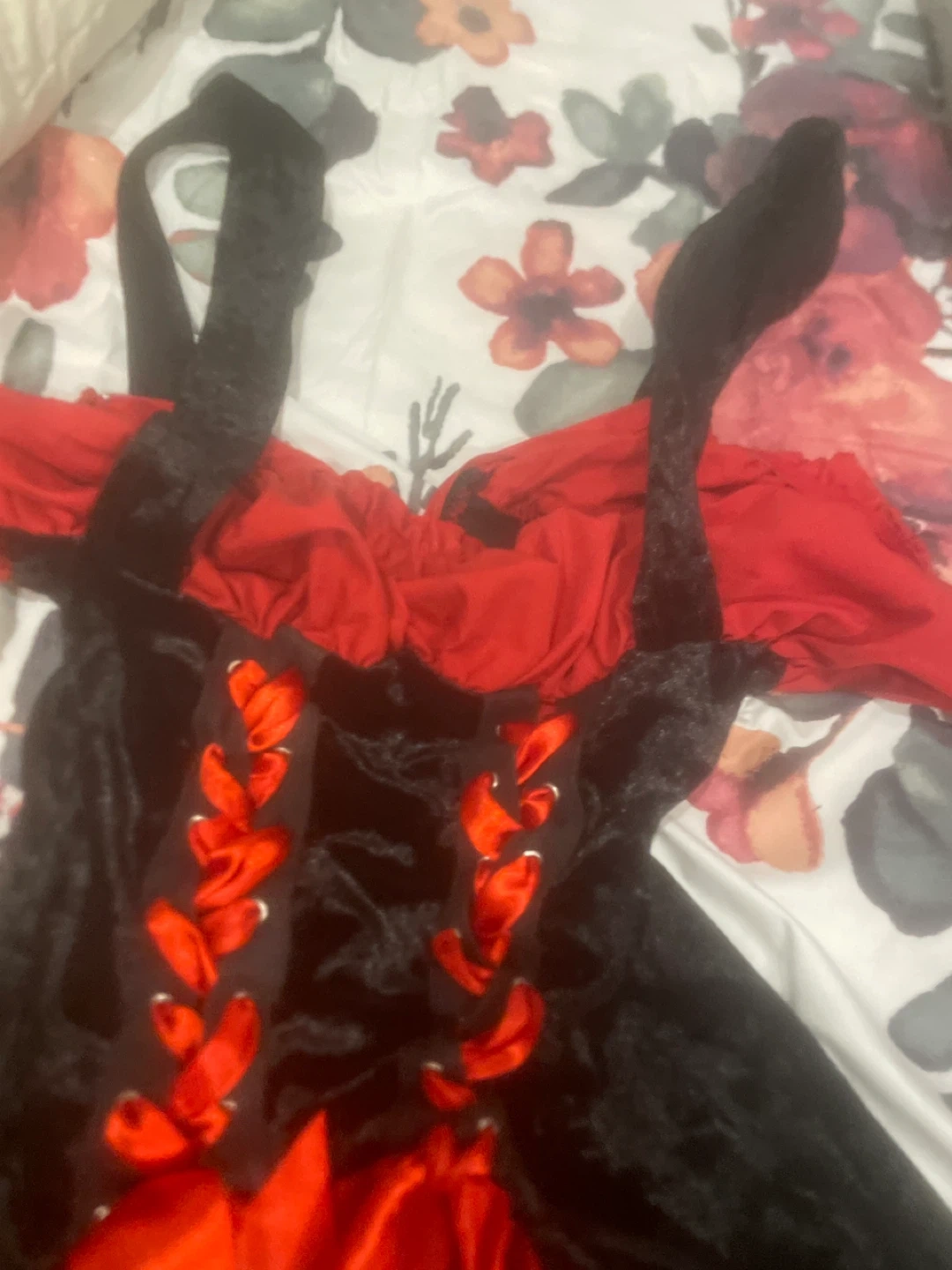 151Selling a 1800S red and black costume dress. It has a velvet-like texture on the black parts and red ribbon detailing in the front. Perfect for a costume party or Halloween!