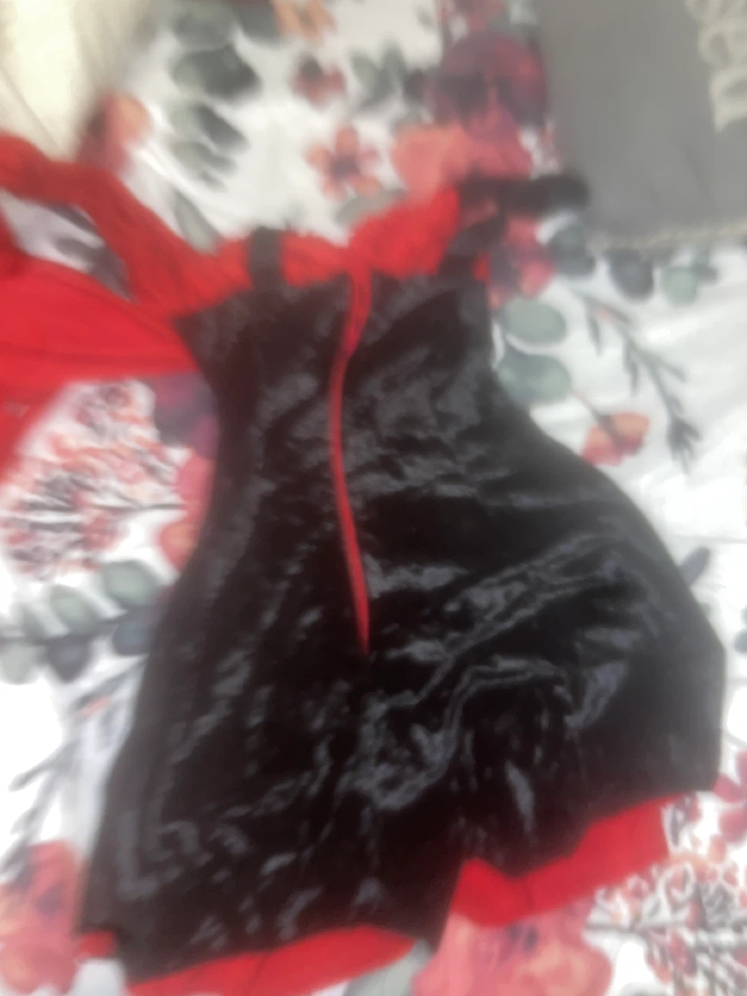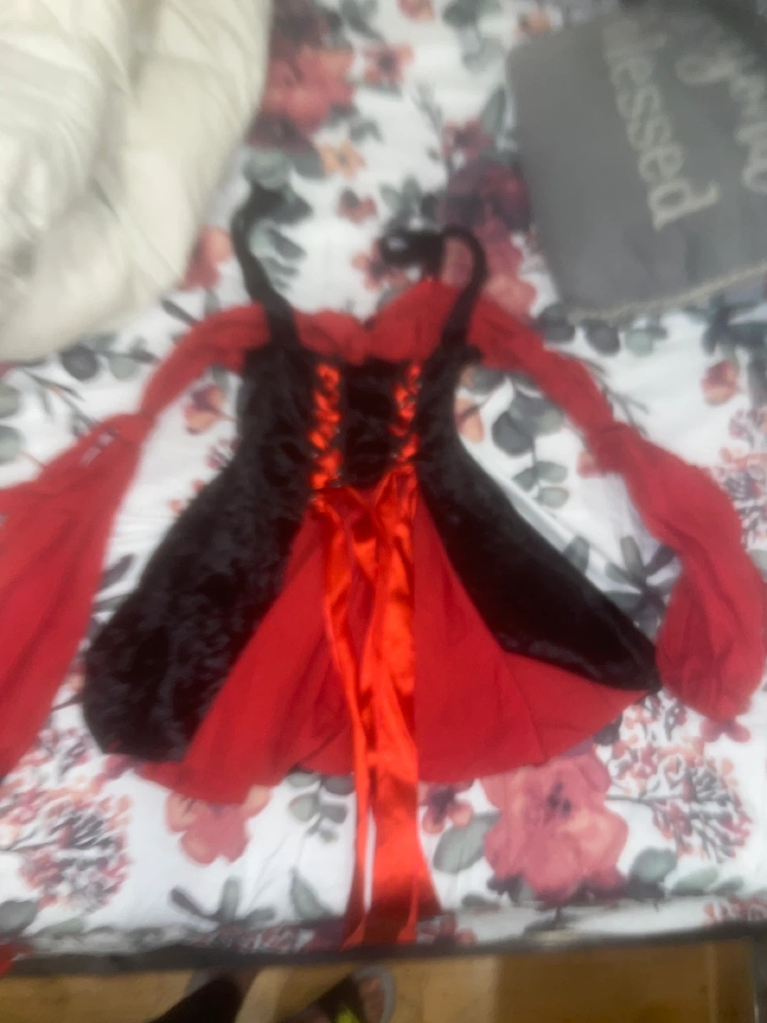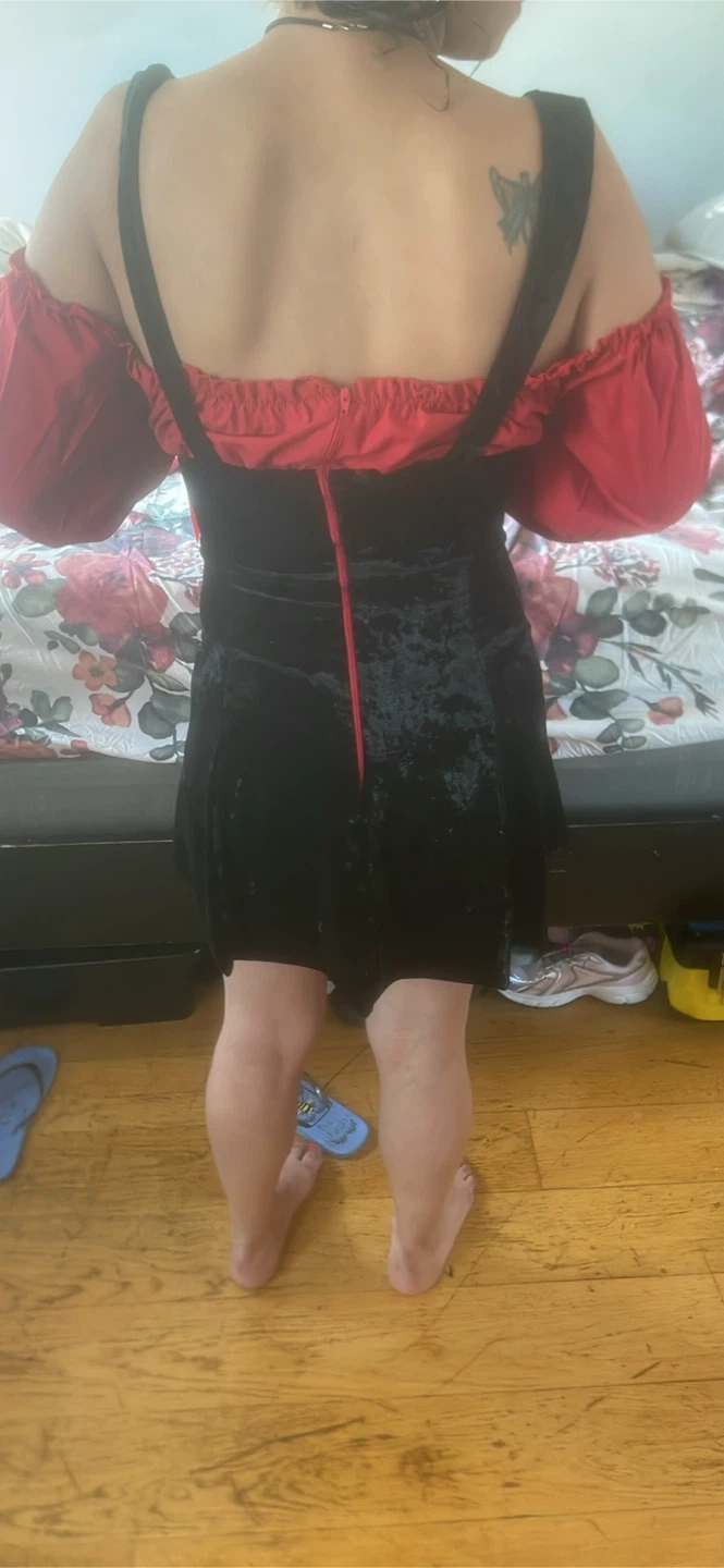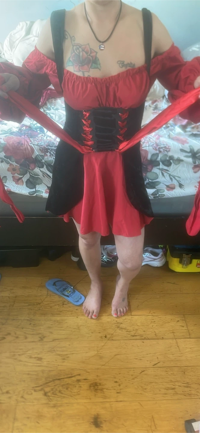 151Selling a 1800S red and black costume dress. It has a velvet-like texture on the black parts and red ribbon detailing in the front. Perfect for a costume party or Halloween!