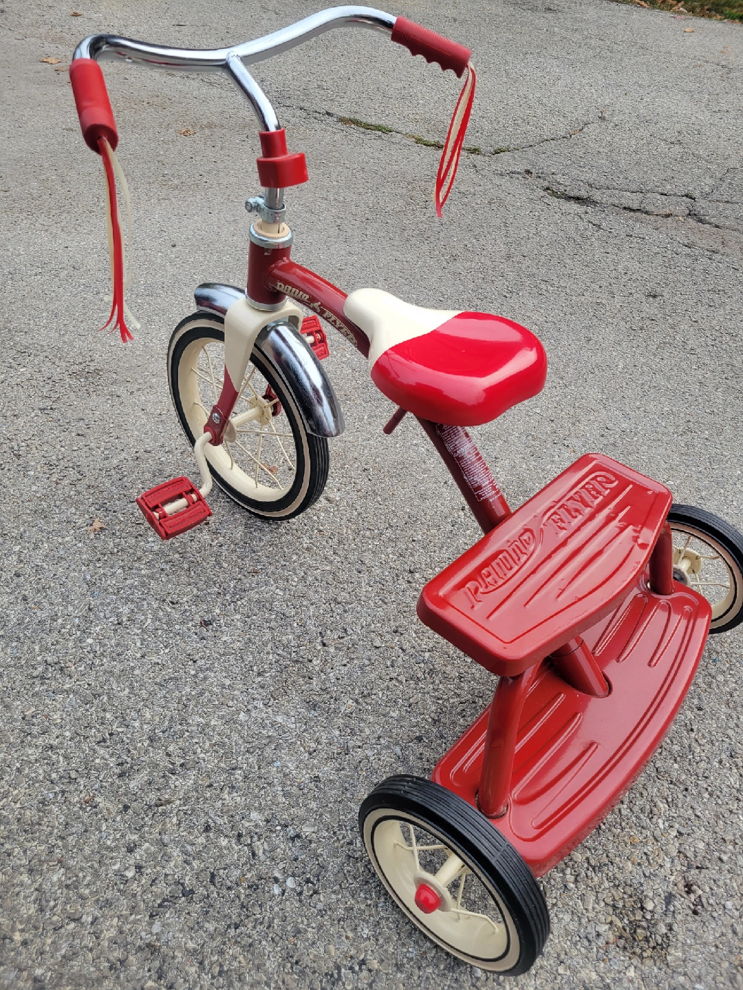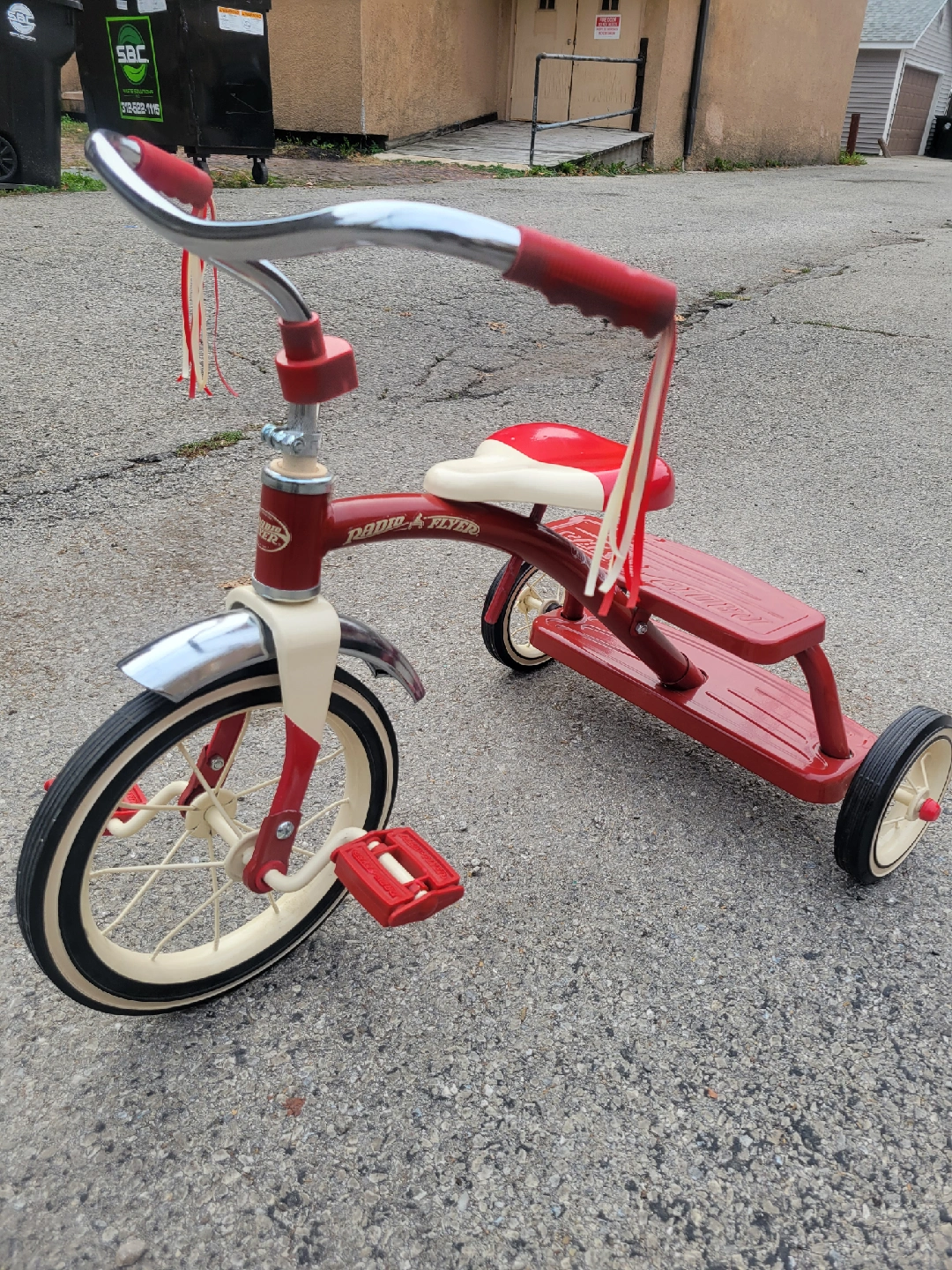 10Selling a classic Radio Flyer tricycle in red! It has a dual deck and is in good condition for some outdoor fun. This retro-style tricycle is perfect for little ones learning to ride.
