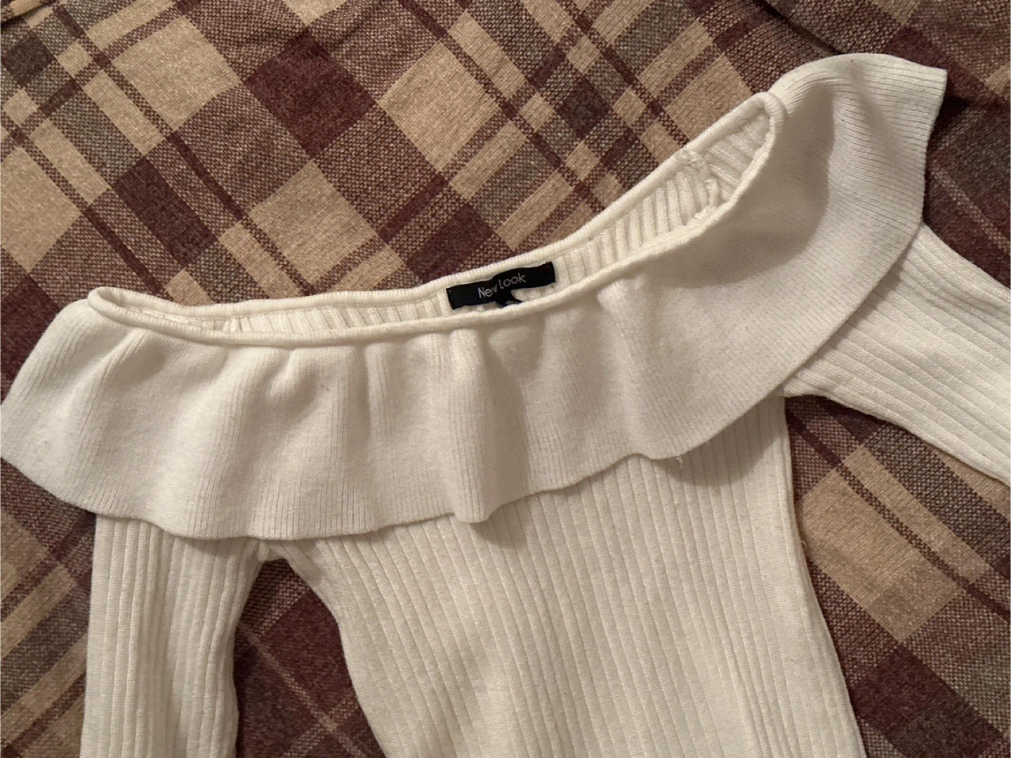 60Selling a New Look off-the-shoulder sweater in white. It's a size XL and has a lovely ruffled neckline. Perfect for adding a touch of elegance to your outfit! It’s stretchy!!