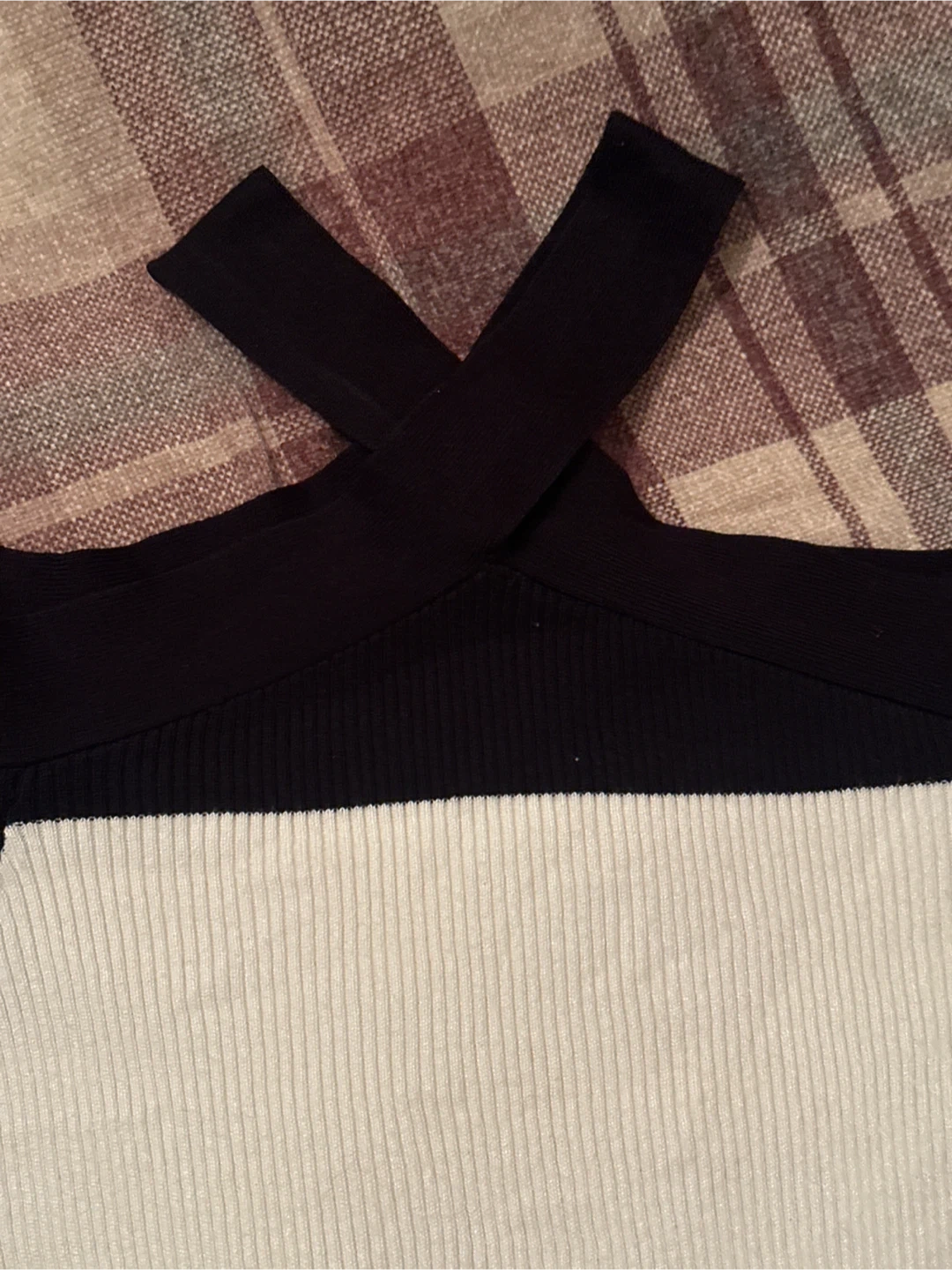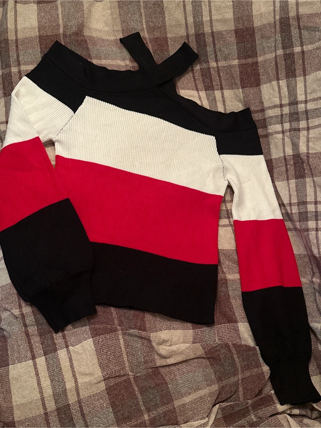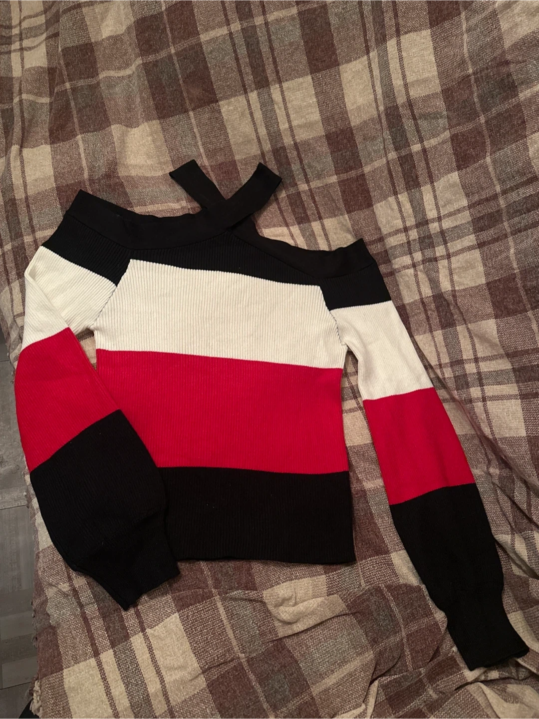 60Selling a cute striped off-shoulder knit top! It features a unique cross-strap design at the shoulder. The colors are black, white, and red. It's perfect for a casual or dressed-up look