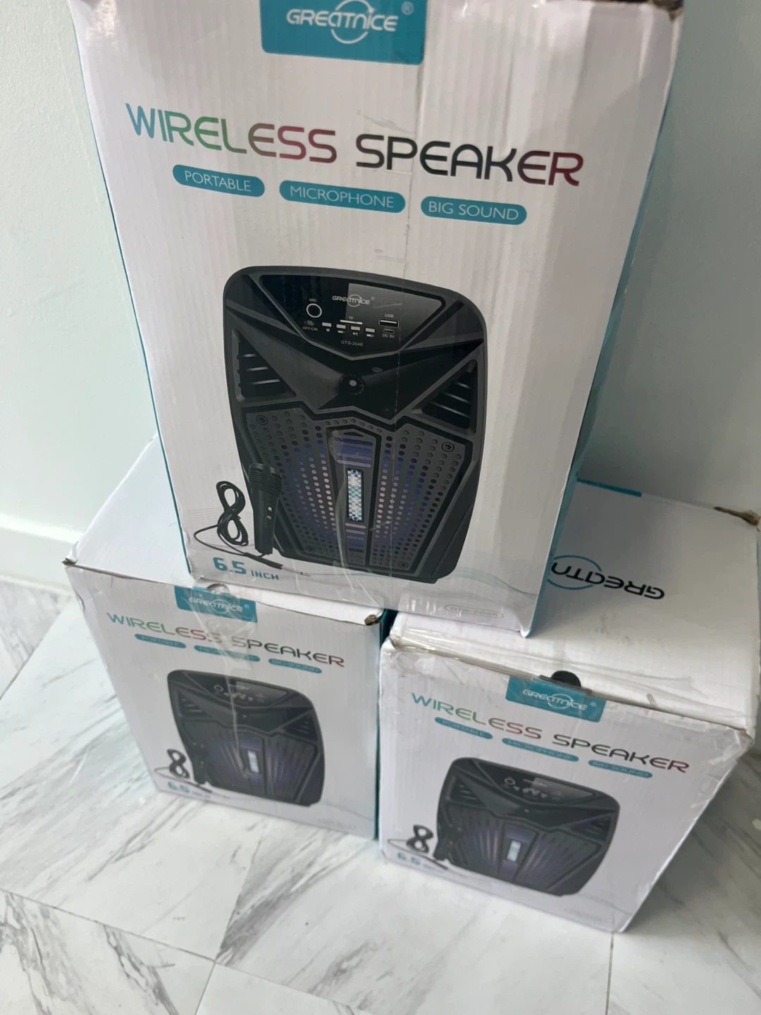 Selling a Greatnice wireless speaker that's perfect for on-the-go use! It's portable and has a microphone, making it great for various occasions. It delivers a big sound in a compact package. It comes in its original box!