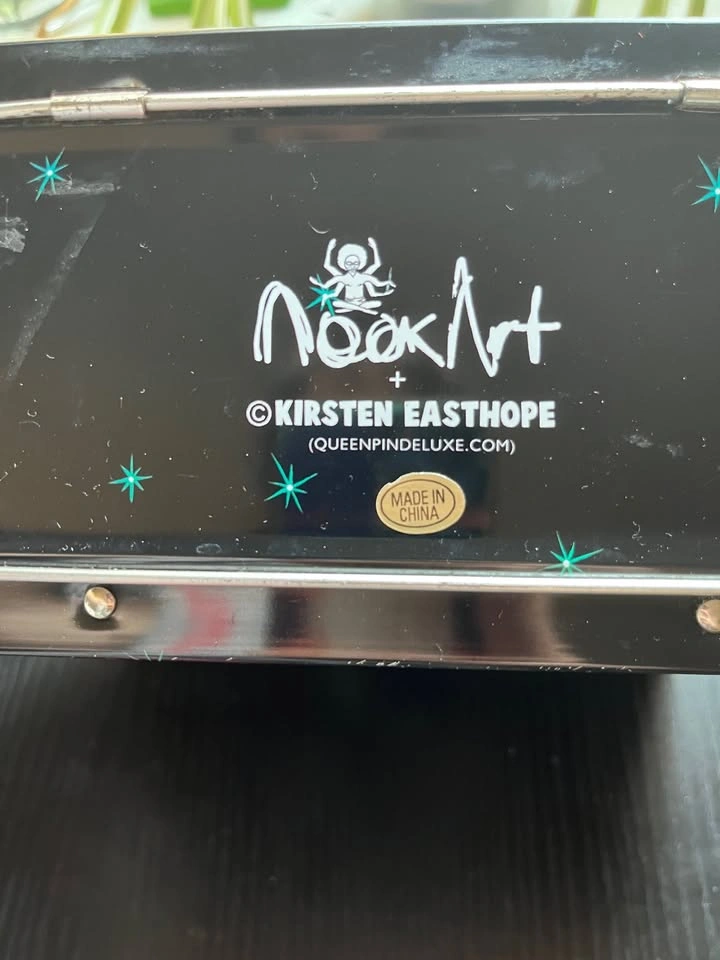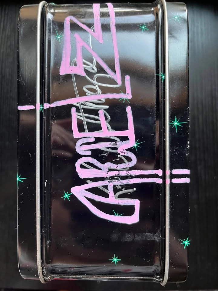 65"Trailerpark Queen" pin-up black metal lunch box. Has writing on the side that can be blacked out.