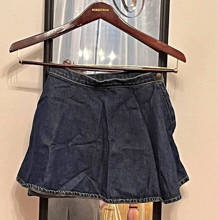 65Vintage American Apparel dark blue denim mini skirt with button/zipper on the side, size x-small.