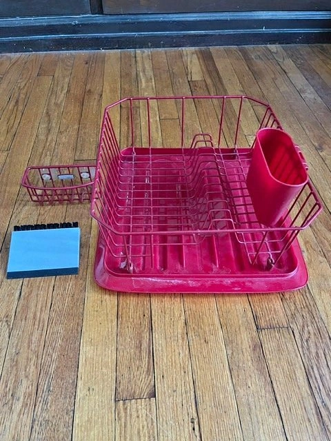 65Red dish drying rack with silverware holder and suctioned sponge holder. Free dish squeegee included.