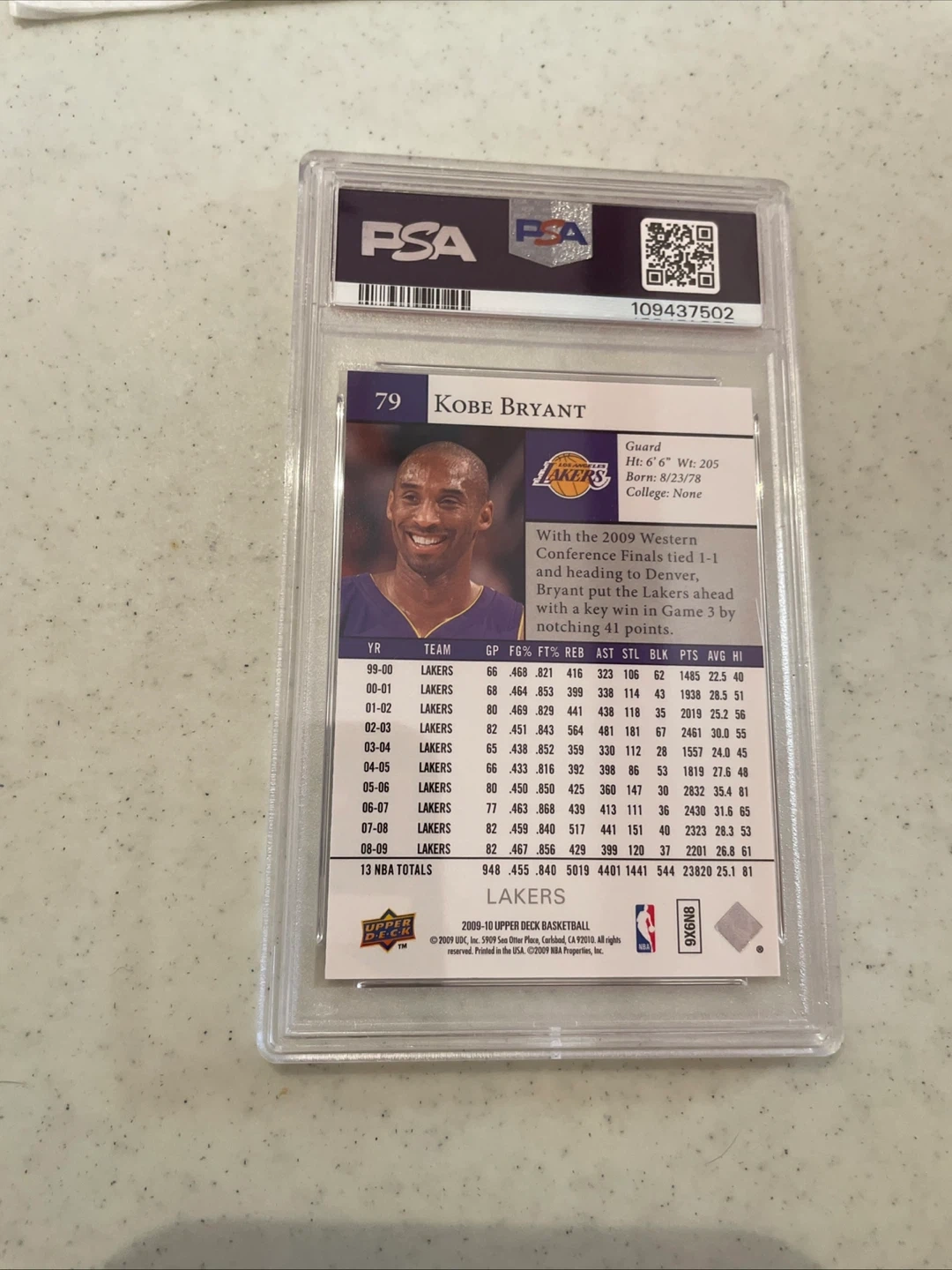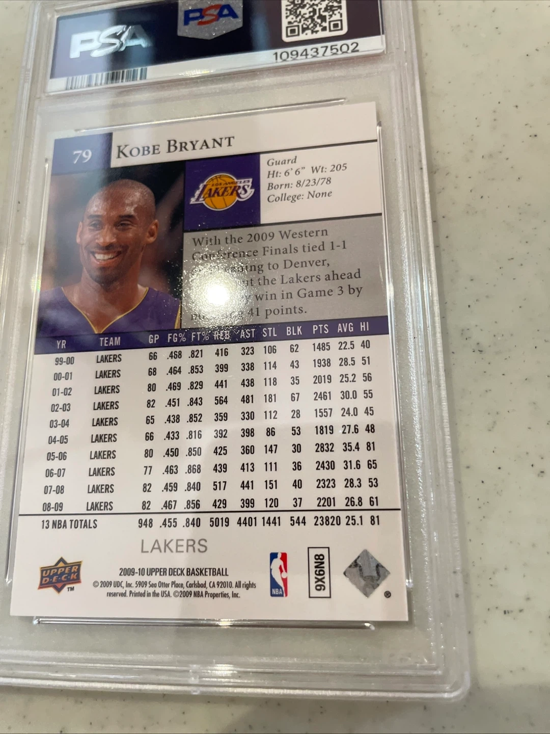 75Selling a 2009 Upper Deck Kobe Bryant card, #79. It's in mint #9 condition! PSA graded with the 2009 Western Conference finals tied 1 to 1 and heading to Denver. Brian put the Lakers ahead with a key win in game 3 by notching 41 points.