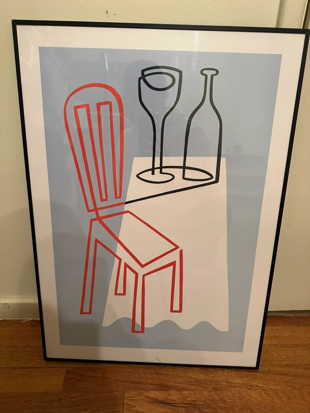 70Framed wall art featuring a red chair, a wine glass, and a bottle. It's a stylish piece to add to any room!