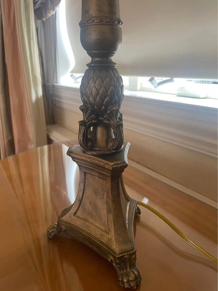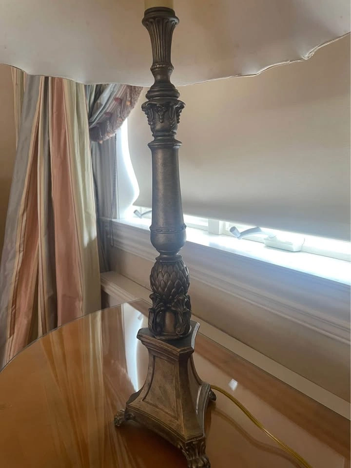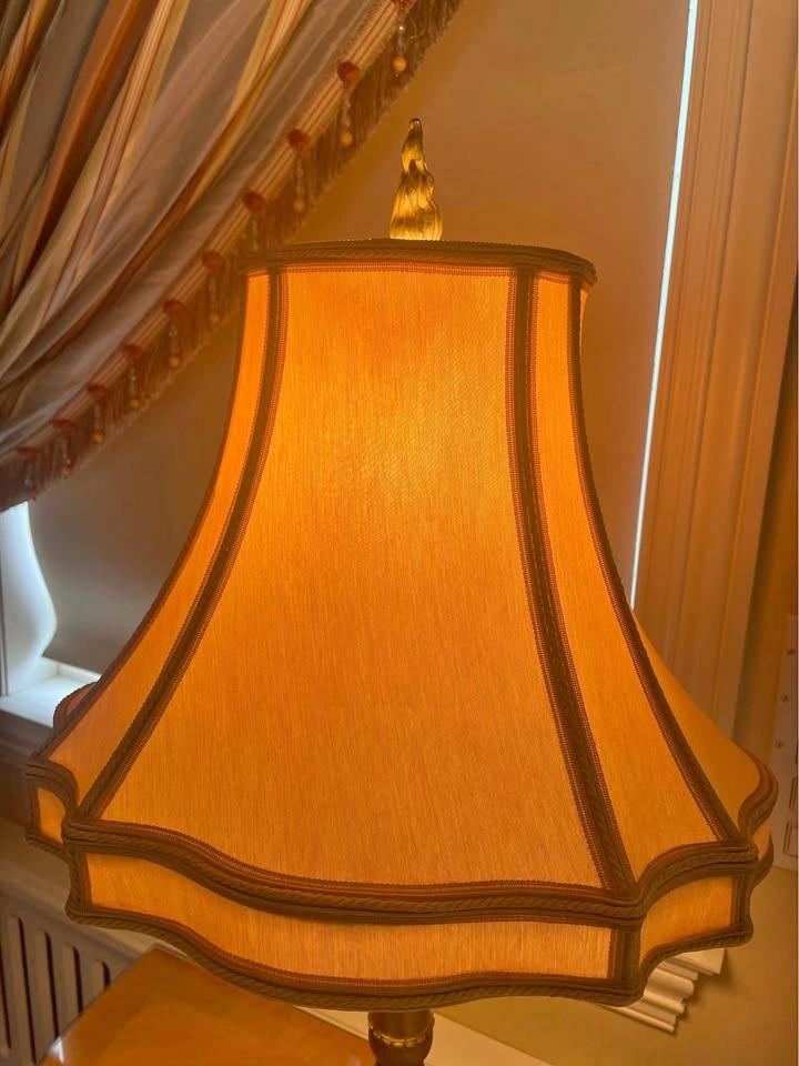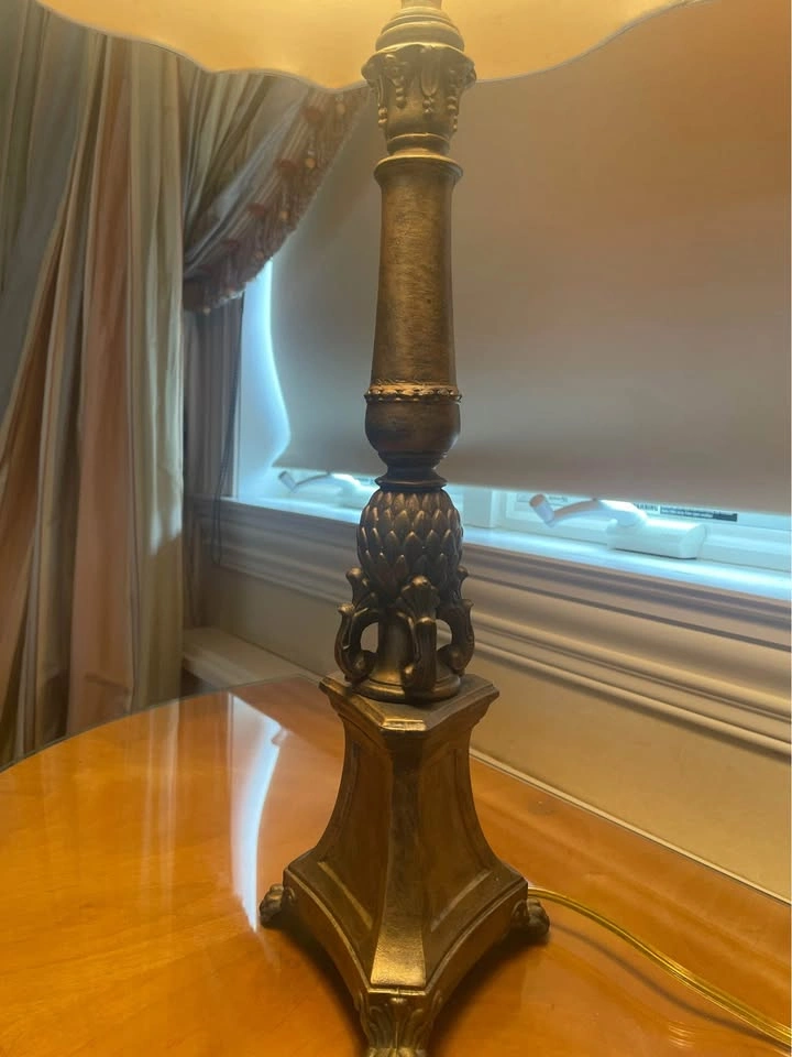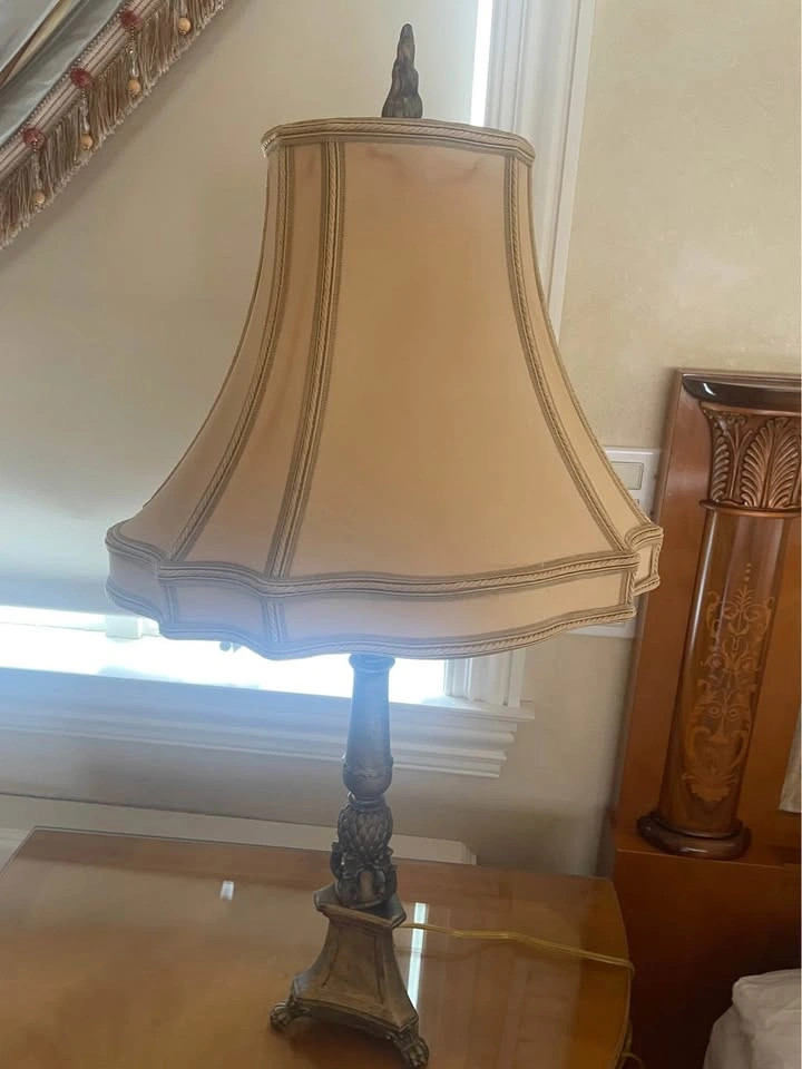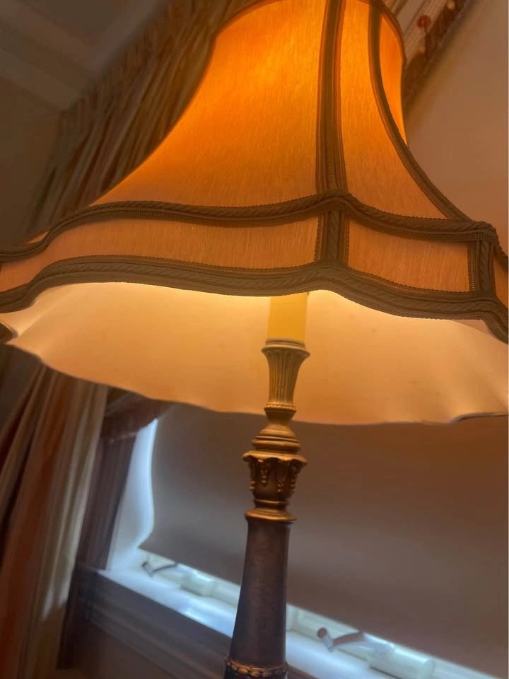 60Pair of tall brass lamps with shades 39” High, 6” triangular base 16” width of shade , $100 each could be sold separately pick up in Brooklyn 11223, 2 for $180