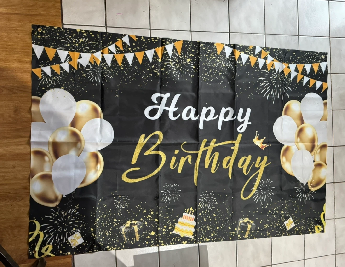 163Selling a cute Happy Birthday banner! It features a black background with gold and white balloons and festive details. Perfect for a birthday celebration!