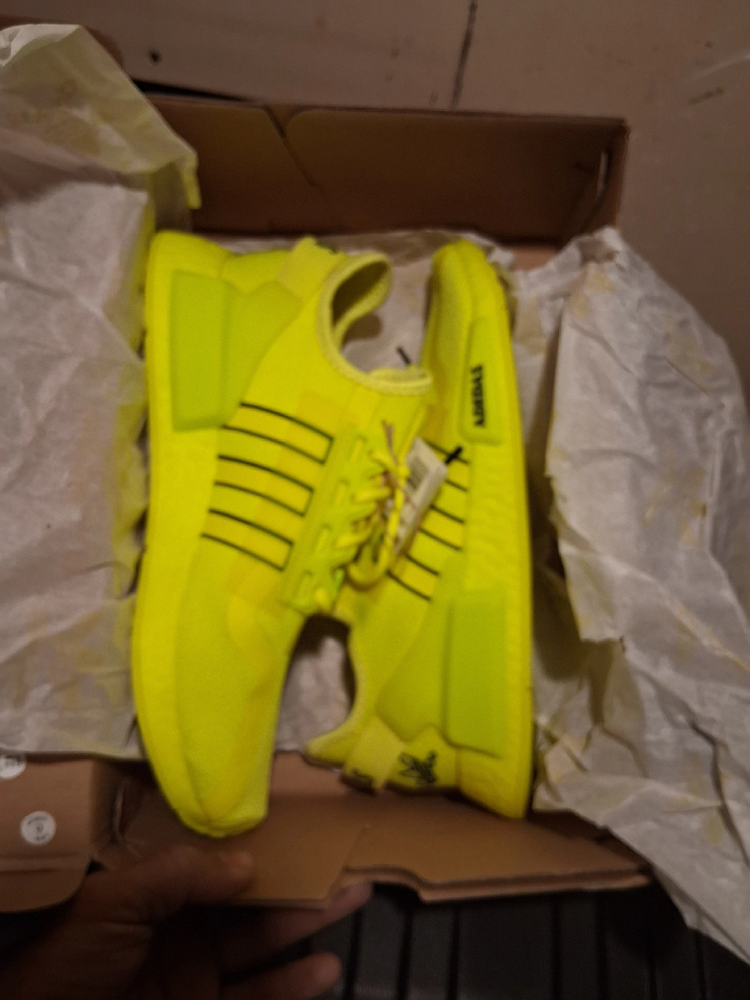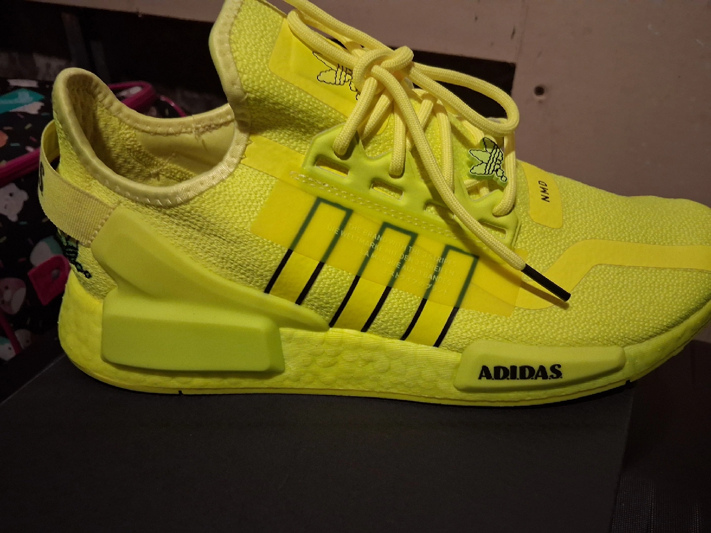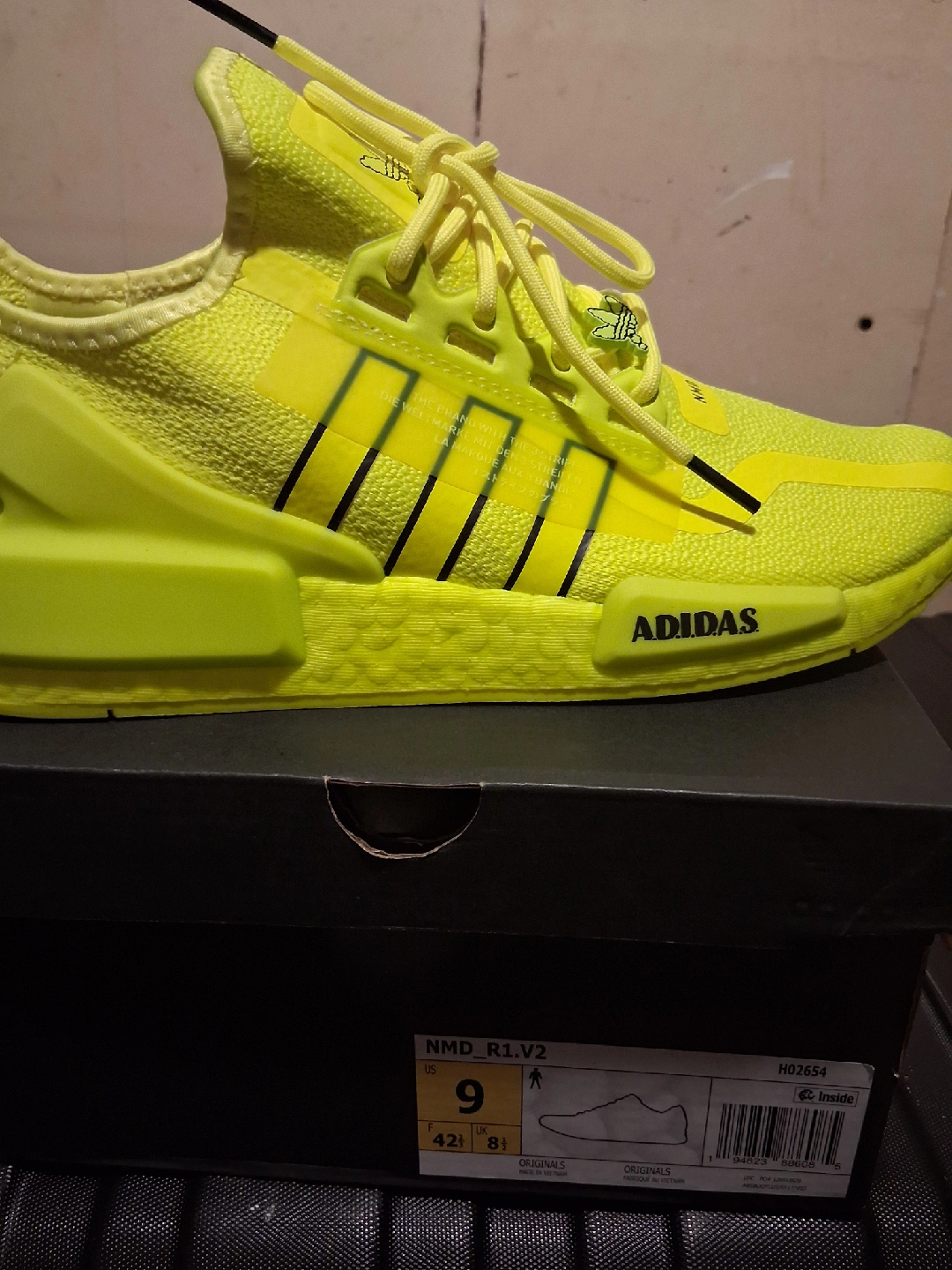 9Selling a pair of Adidas NMD R1 V2 sneakers in a vibrant yellow color! They come in the original box and are a US size 9. These shoes are super comfortable and stylish, perfect for everyday wear or hitting the gym