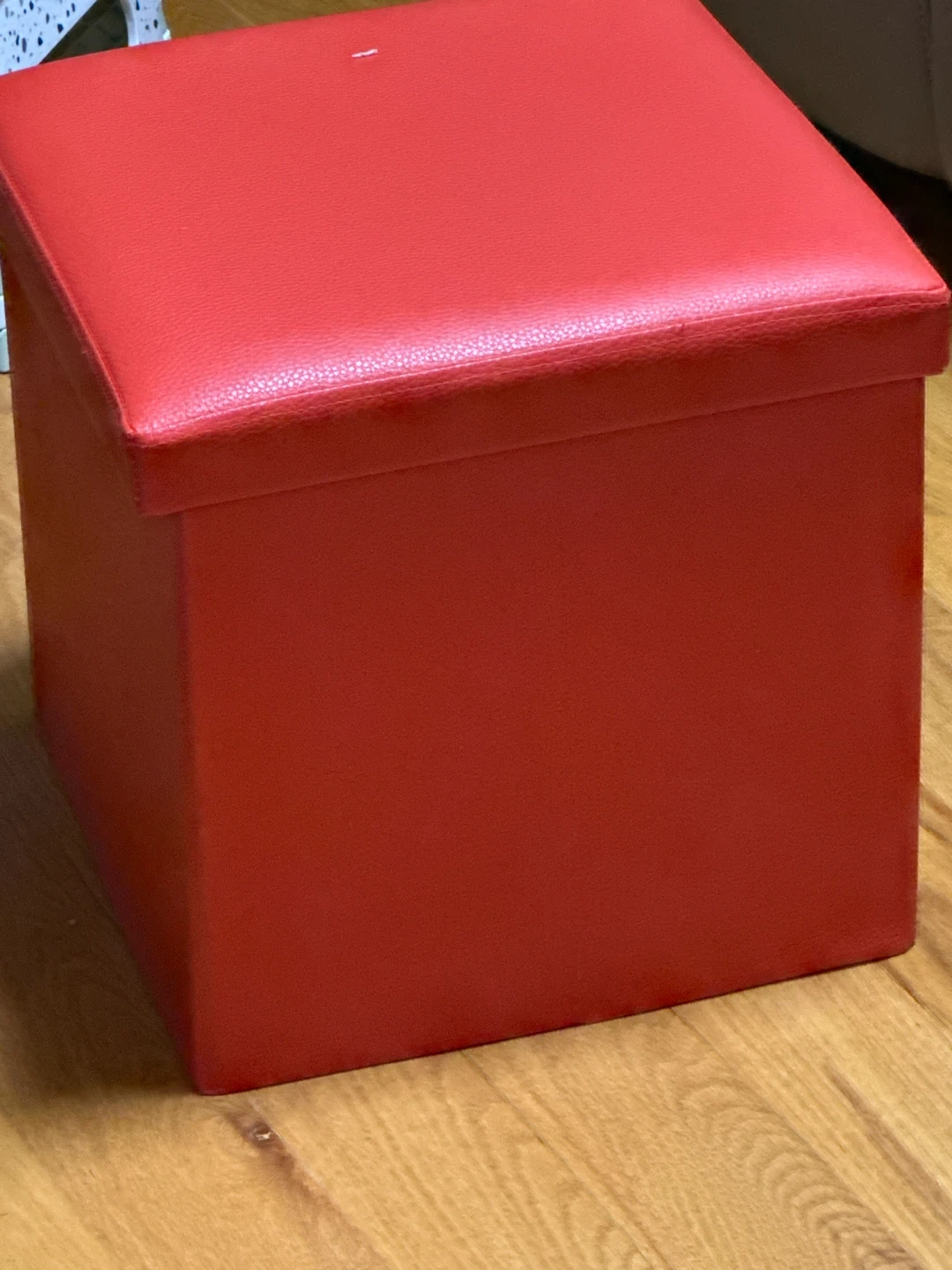 72Here is a red storage ottoman. It is in good condition and can be used for storage or as a footrest. The ottoman is a cube shape and has a lid that lifts up to reveal the storage space inside