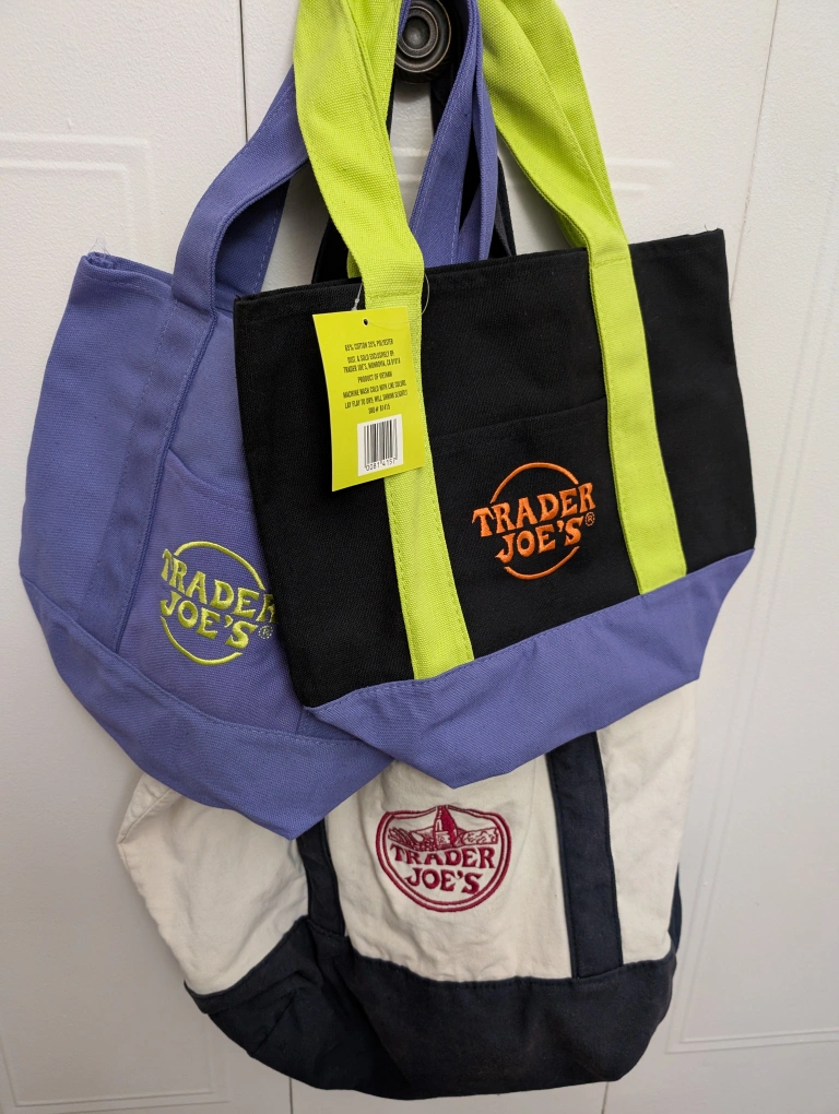 55Selling a bundle of Trader Joe's tote bags! Includes a purple, black, and cream-colored bag. Perfect for groceries or everyday use Trick or treat canvas tote bag Take note that the white canvas tote has stains on the inside Take all for $23