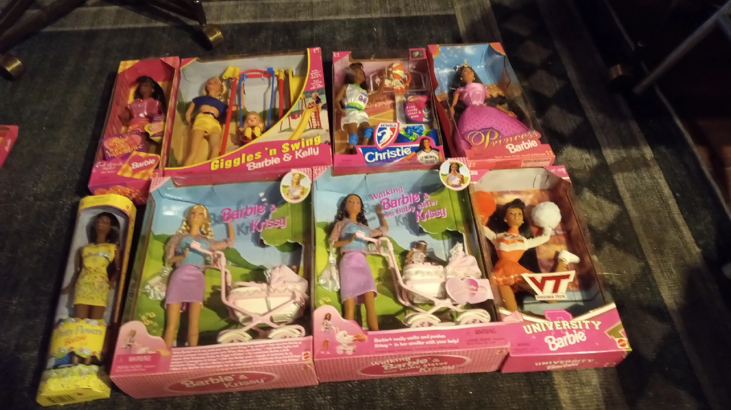 I have a collection of 9, new barbie dolls, including walking barbie baby & new baby sister, Barbie & Krissy, and Giggles' n swing. good Price if sold together. this is every girls wish list for Xmas. will sell separately.