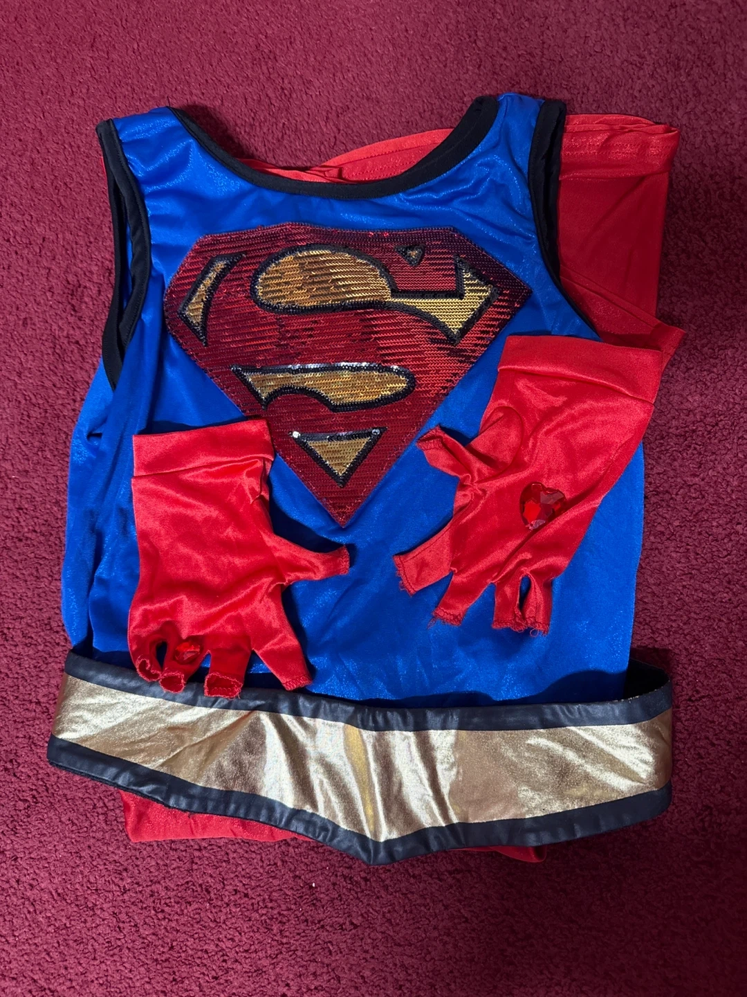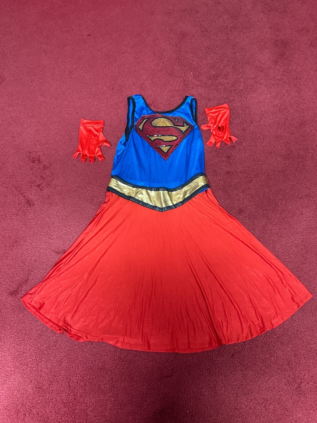 Best for Halloween .🎃 Get ready for dress-up time with this adorable Supergirl costume! It includes the dress and a pair of matching gloves. Perfect for your little superhero! Size 14 to 16