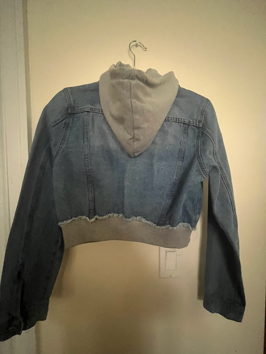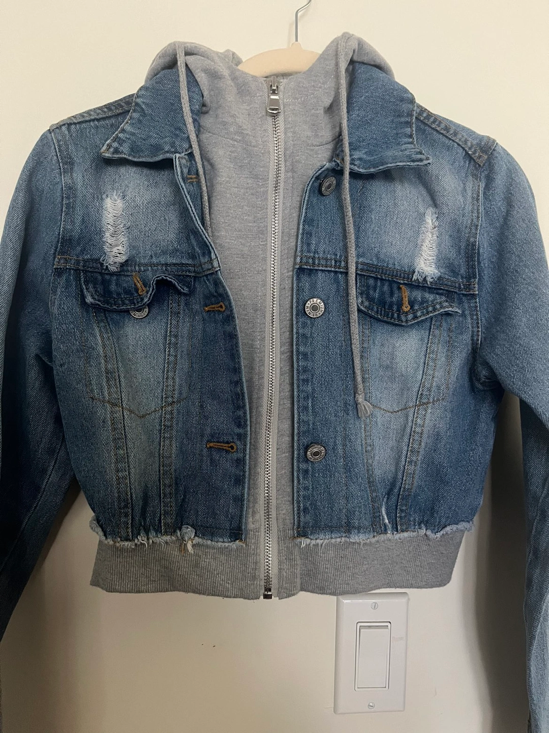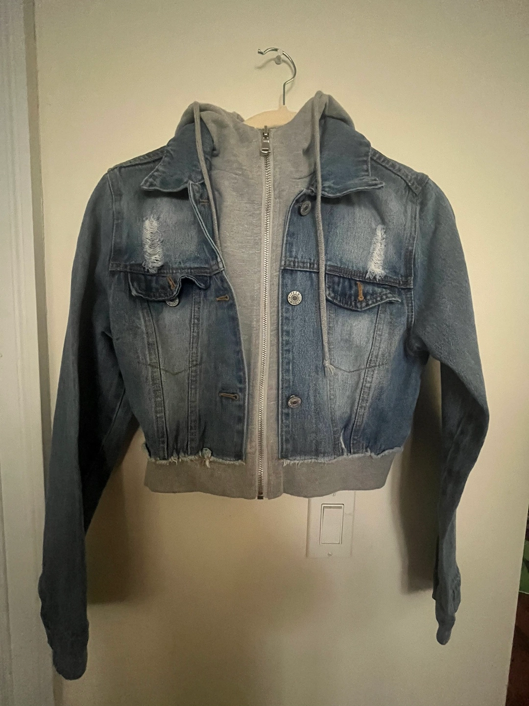 I looove this Jean jacket. Perfect with some black or grey sweats or jeans. I’m only selling because I gained some weight and now it’s too tight on me.