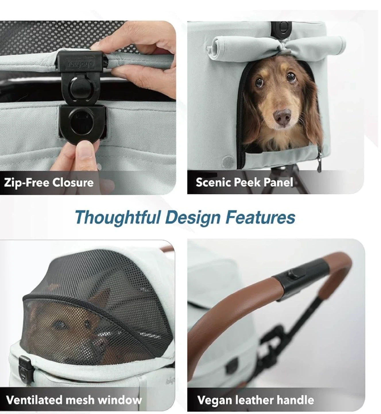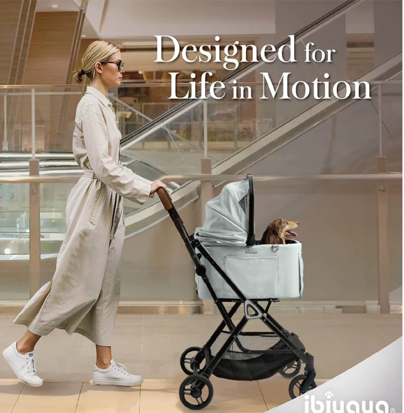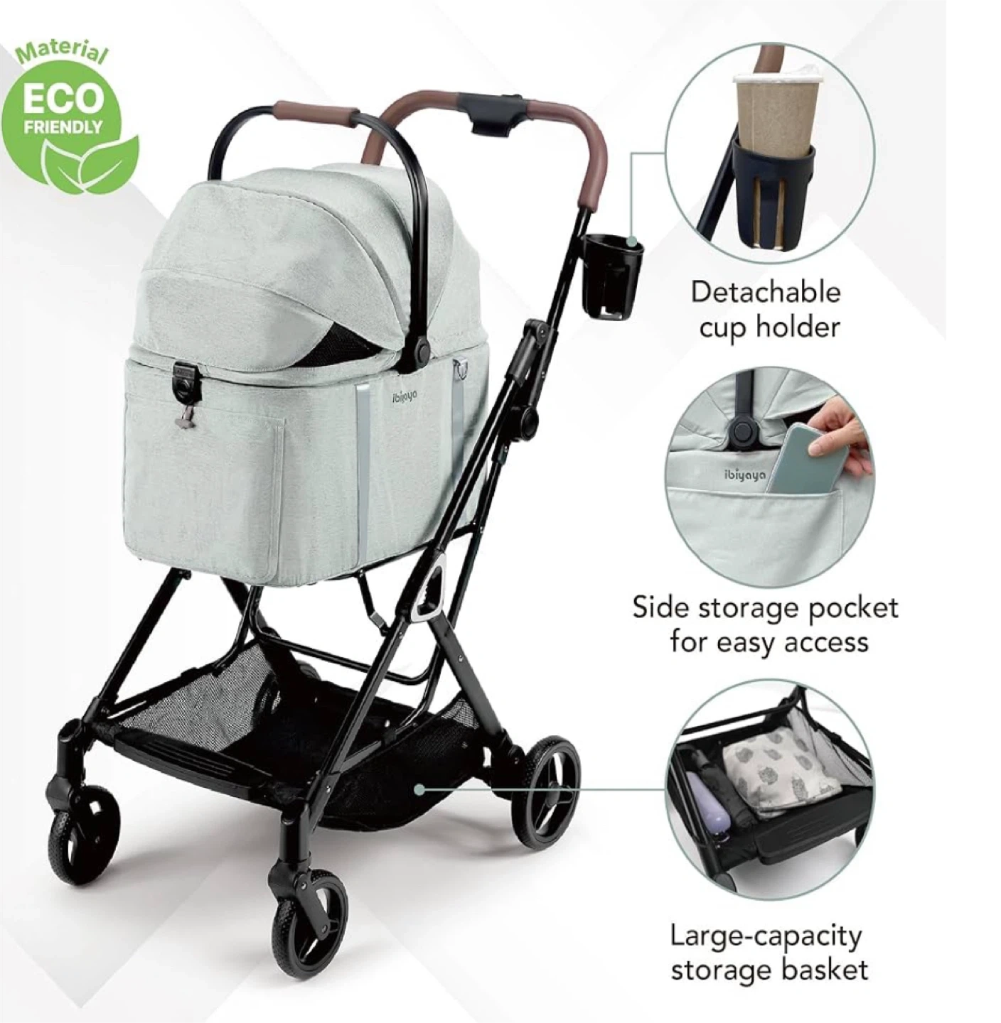 This ibiyaya pet carrier stroller is designed for life in motion! It features a quick-fold mechanism, making it easy to fold and take anywhere. It's a 3-in-1 versatile design that can be used as a stroller, detachable carrier, or car seat basket. The lightweight tri-fold frame and fully washable interior add to its convenience and practicality