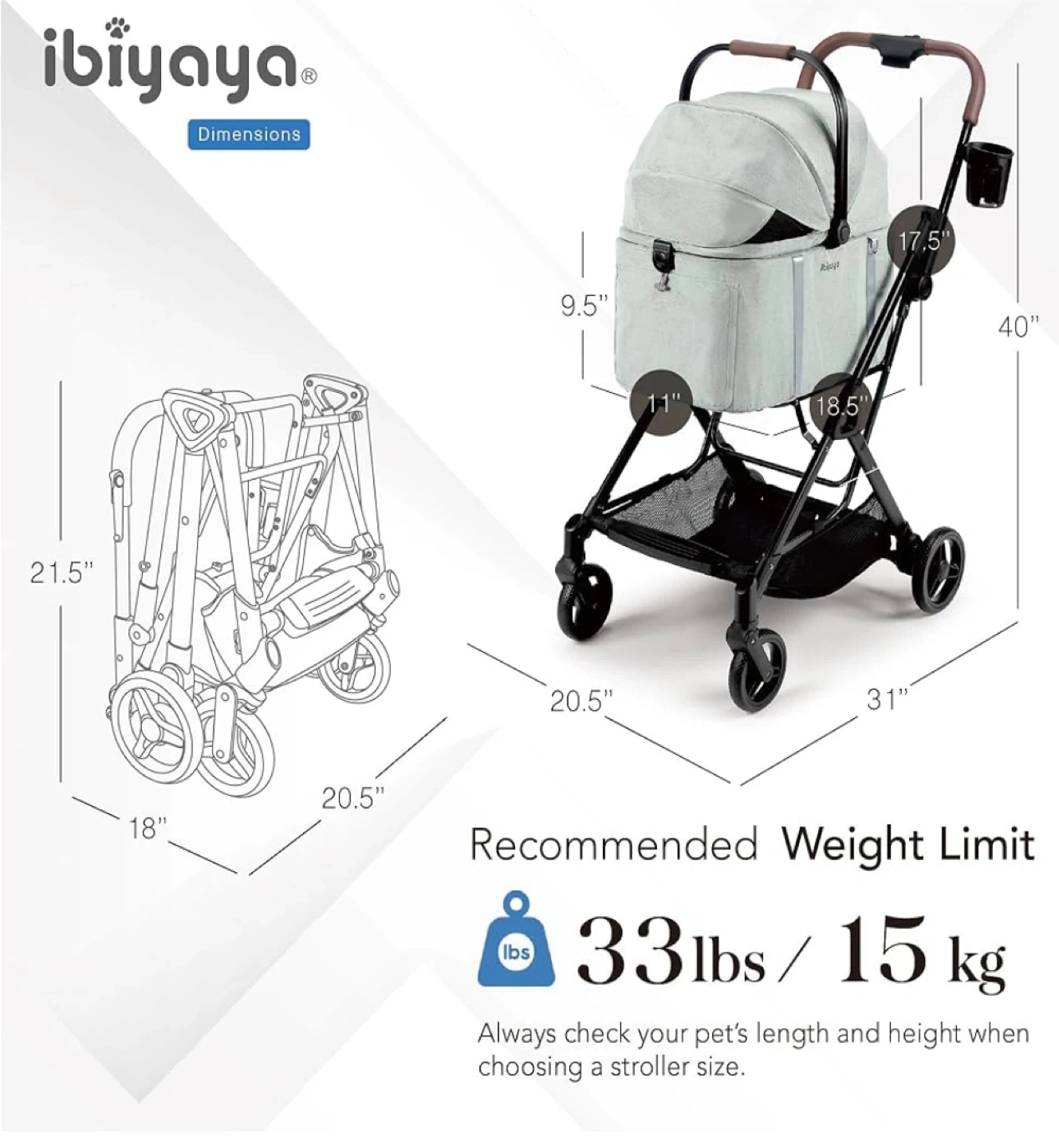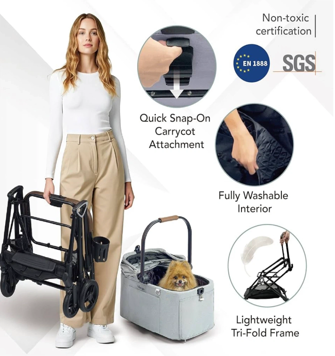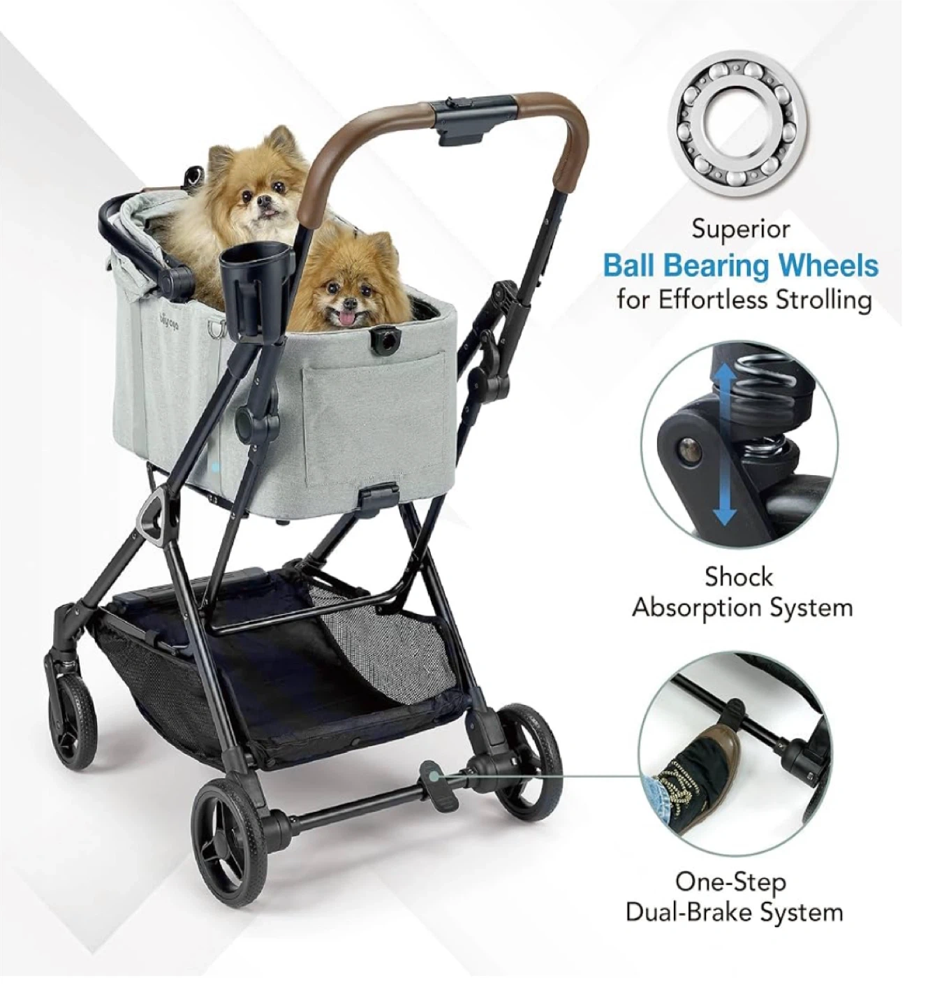 This ibiyaya pet carrier stroller is designed for life in motion! It features a quick-fold mechanism, making it easy to fold and take anywhere. It's a 3-in-1 versatile design that can be used as a stroller, detachable carrier, or car seat basket. The lightweight tri-fold frame and fully washable interior add to its convenience and practicality