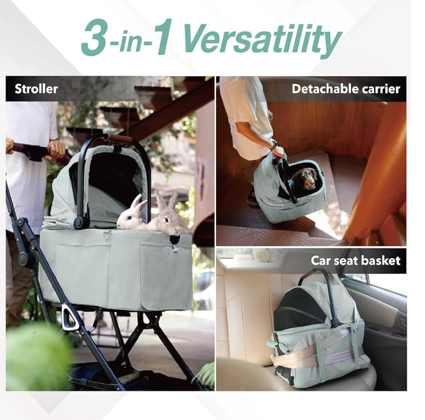 Pet Stroller for Small Dogs and Cats – 3-in-1 Pet Carrier, Dual-Opening Canopy, No-Flat Wheels, Vegan Leather Handle, Large Storage Basket (Sage Green)