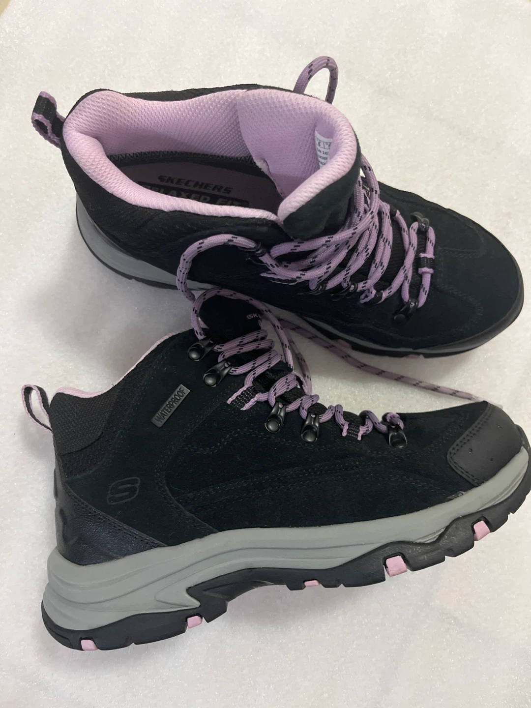 Selling a pair of Skechers hiking boots in women's size 8. They're black with a touch of light purple, and are waterproof! These are in great shape and ready for your next adventure