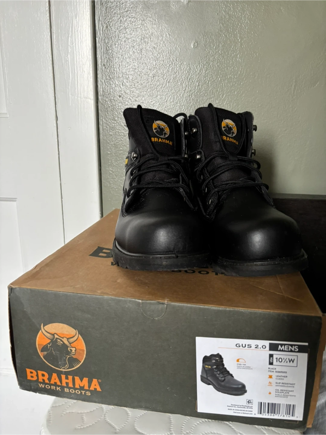 Brahma Gus 2.0 mens work boots. Black, leather upper with steel toe protection. Slip-resistant rubber sole. Includes original box.
