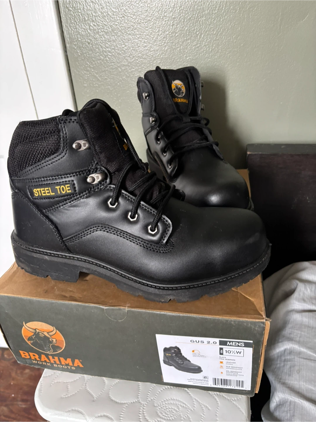 Brahma Gus 2.0 mens work boots. Black, leather upper with steel toe protection. Slip-resistant rubber sole. Includes original box.