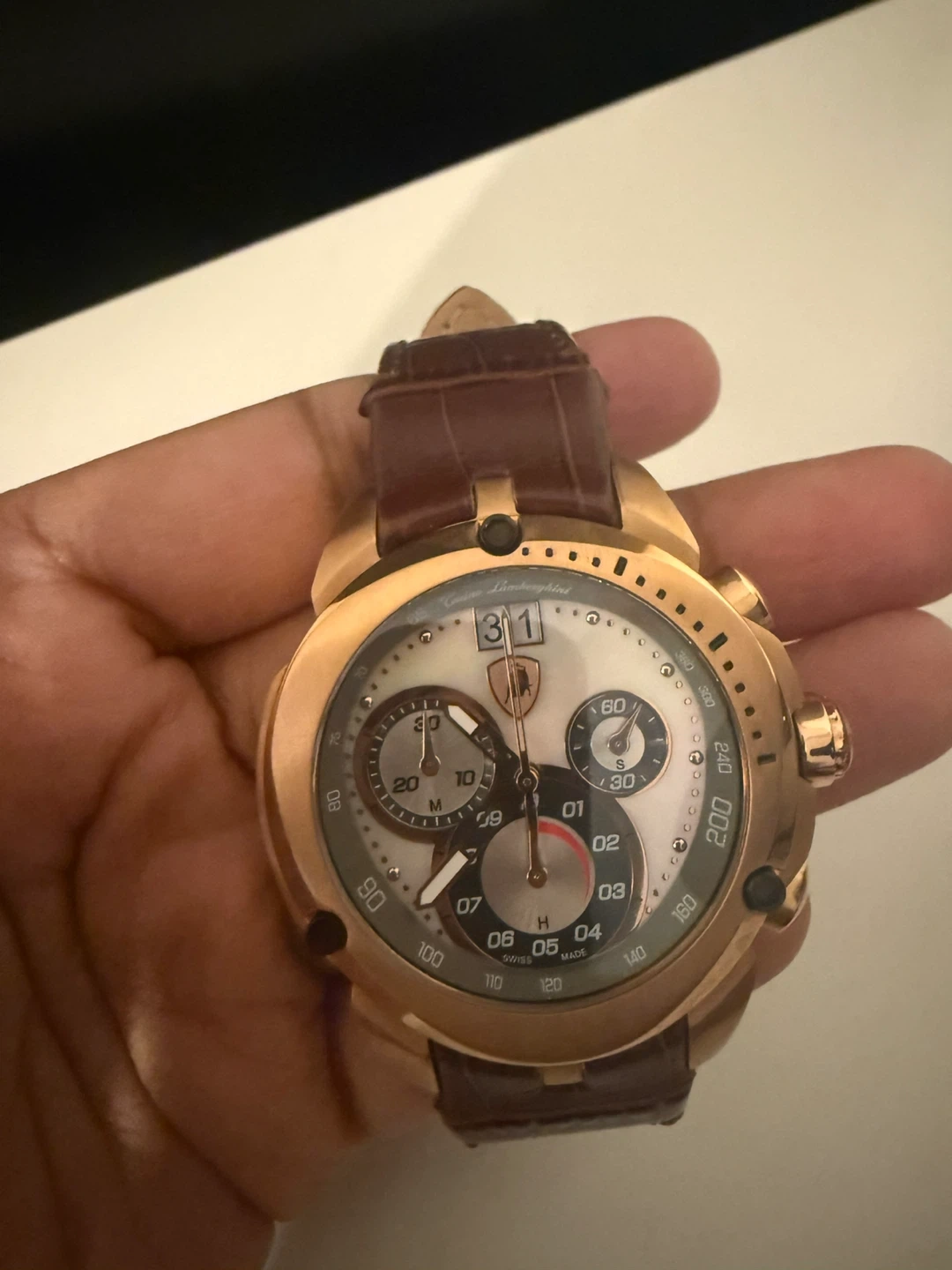 Selling a Tonino Lamborghini watch with a brown leather strap. The watch face features chronograph subdials and a date window. Needs battery replacement also need a new strap. I have the authenticity card too.