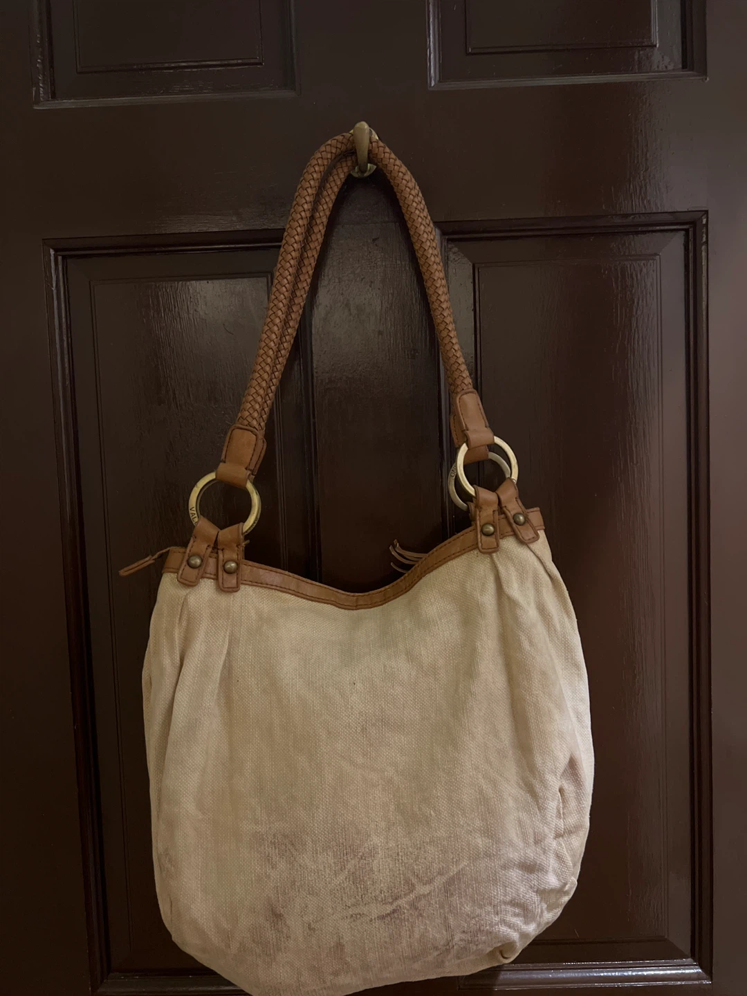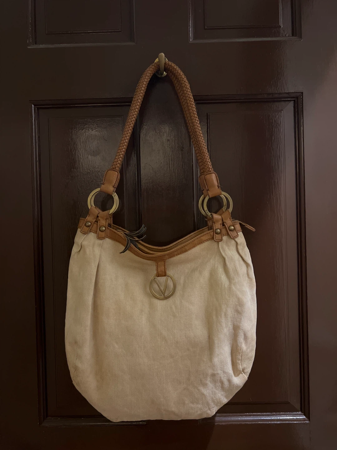 Selling a a vintage Valentino Orlandi hobo bag in beige canvas. It's a stylish and functional bag with braided handles and leather trim. Perfect for everyday use!