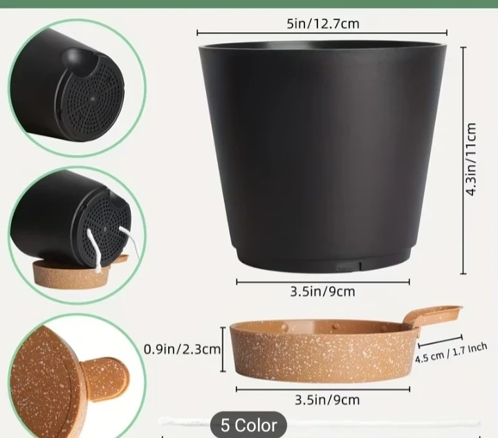 These white self-watering planter pots include saucers for convenience. They're designed for easy plant care. Each pot measures 5 inches wide and 4.3 inches tall. The saucers are 3.5 inches wide and 1.7 inches tall. Great for indoor or outdoor plants!