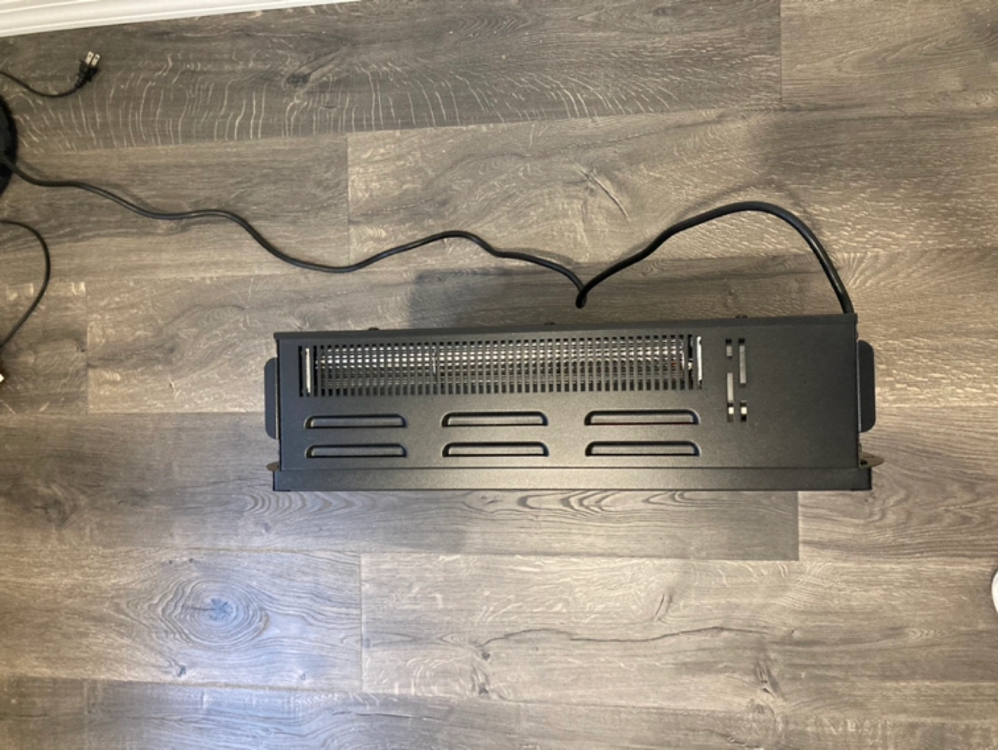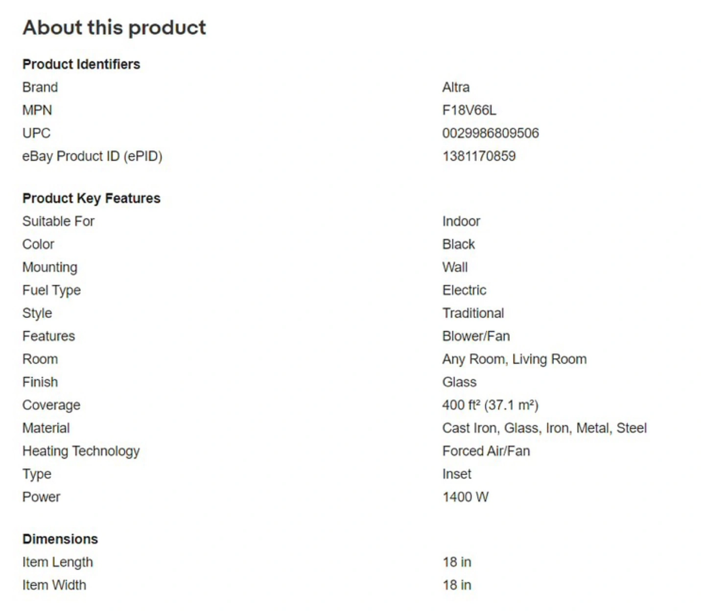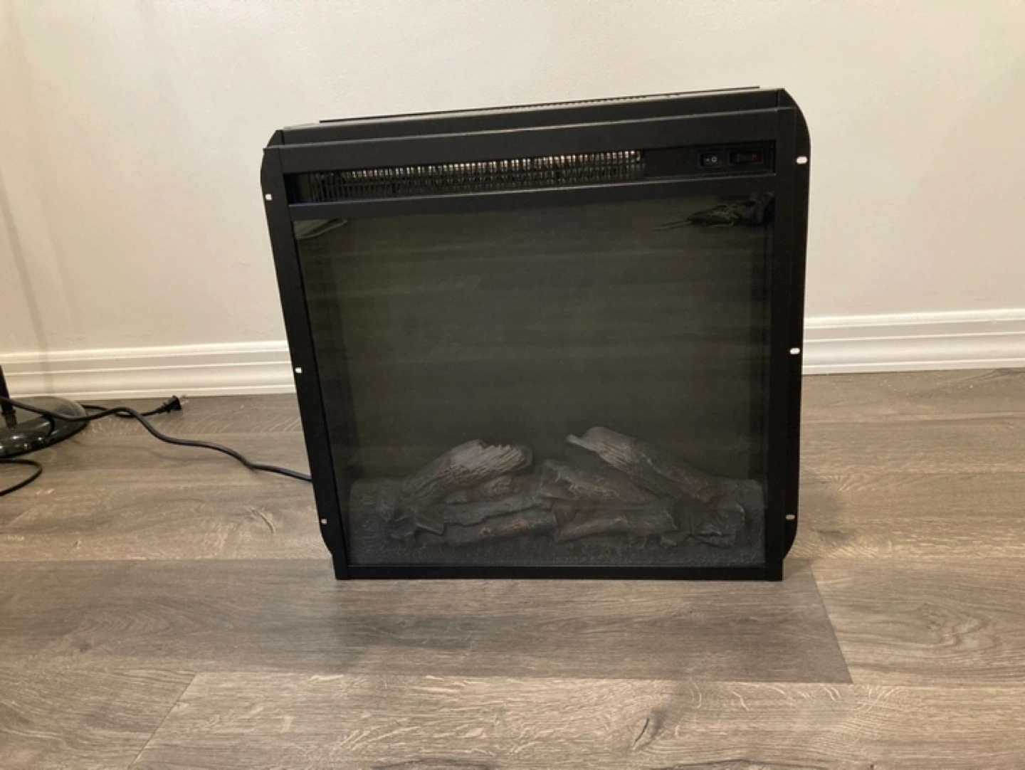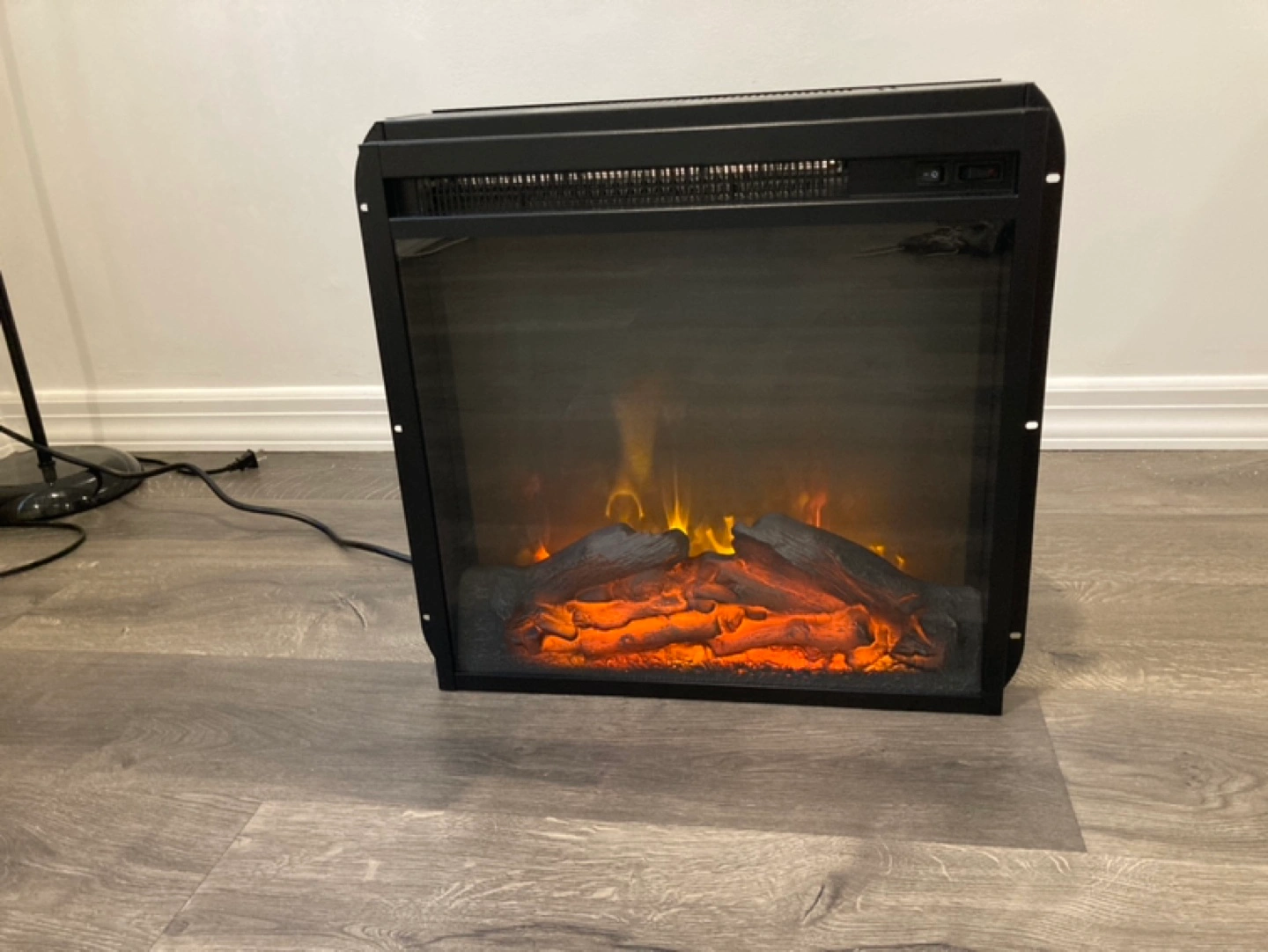 Electric fireplace with realistic flame effect. It also has a heater that works perfectly without any flaws. When the part that represents the fire is turned on it makes a barely audible sound so I bought a new one that I built into the TV shelf. Don’t need this one.