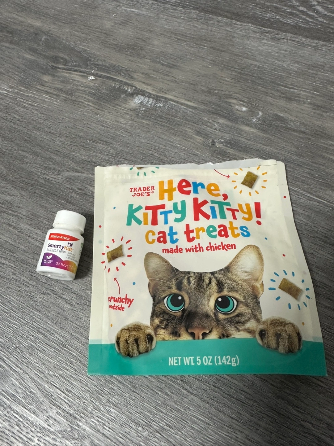 Bundle includes one bottle of SmartyKat Bubble Nip catnip & one bag of Trader Joe's cat treats
