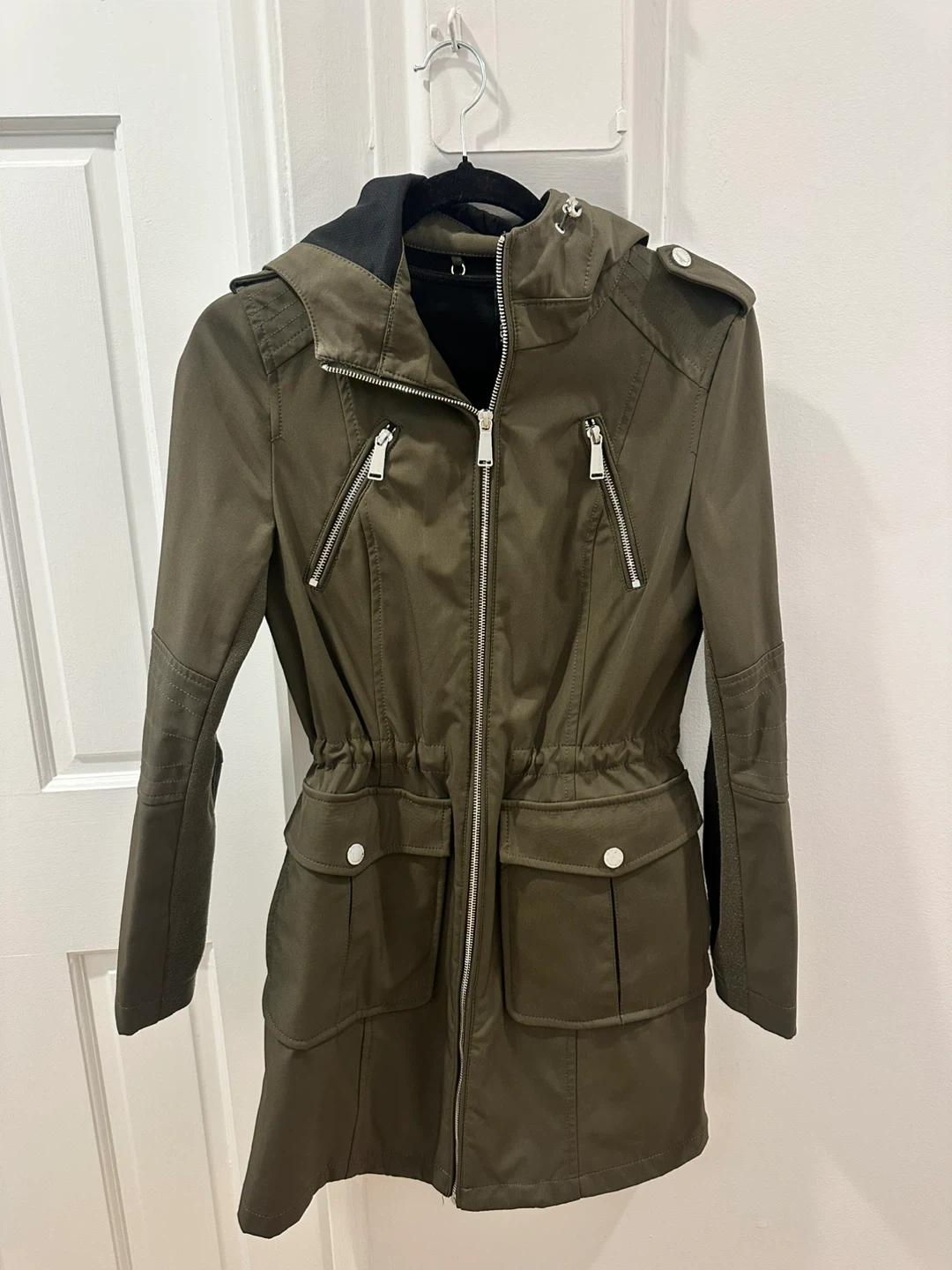 Selling a BCBGeneration jacket in olive green. It's a size small and features a hood and multiple zipper pockets. Great for layering!