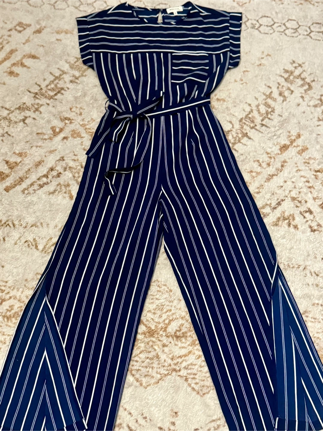 Monteau LA navy and white striped jumpsuit. It comes with a self-tie belt and has wide legs. This jumpsuit is perfect for a casual day out or a relaxed evening event!