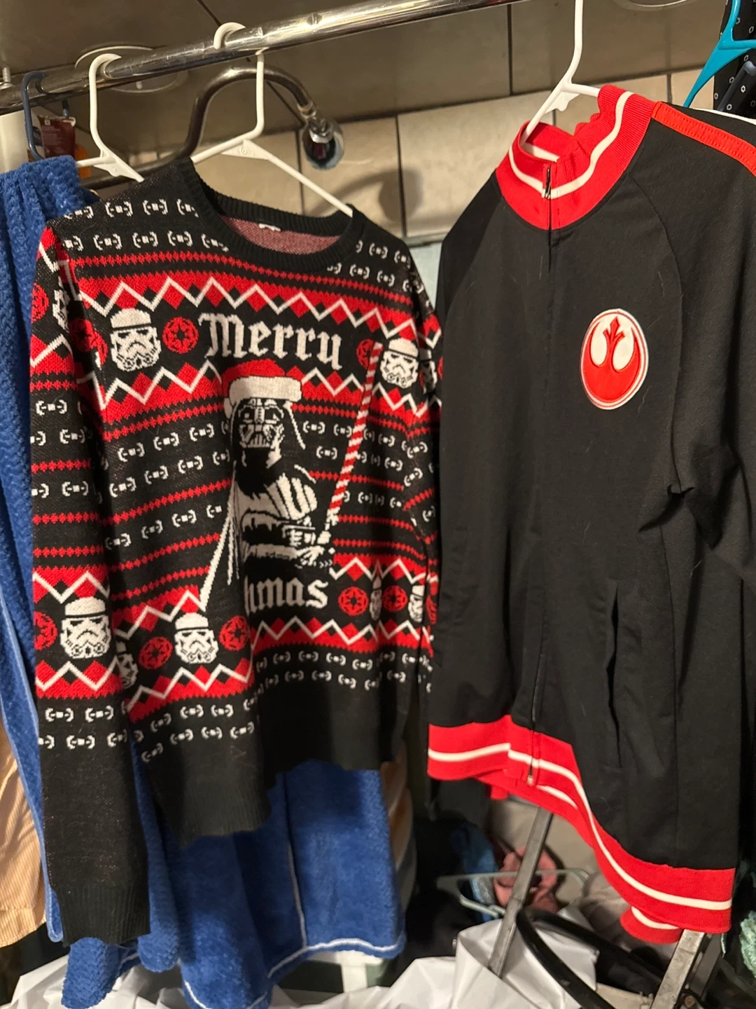 Black Star Wars Christmas sweater featuring Darth Vader and Stormtroopers. Red and white "Merry Christmas" text and fair isle pattern. Rebel Alliance logo jacket is also included . Size L