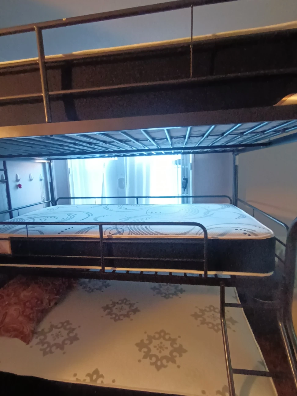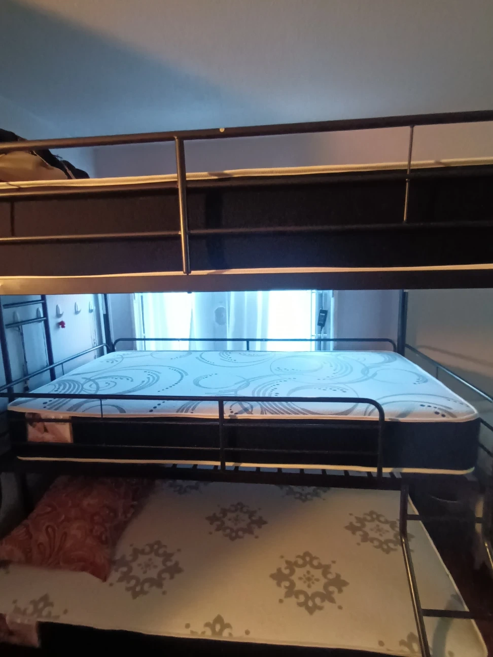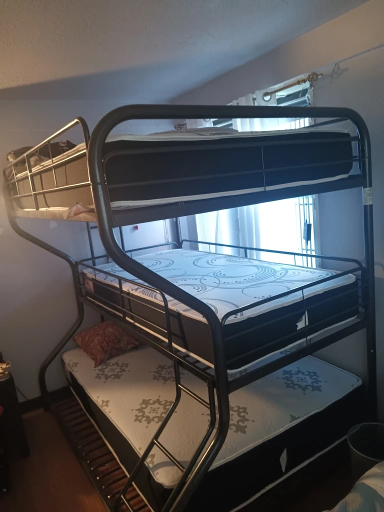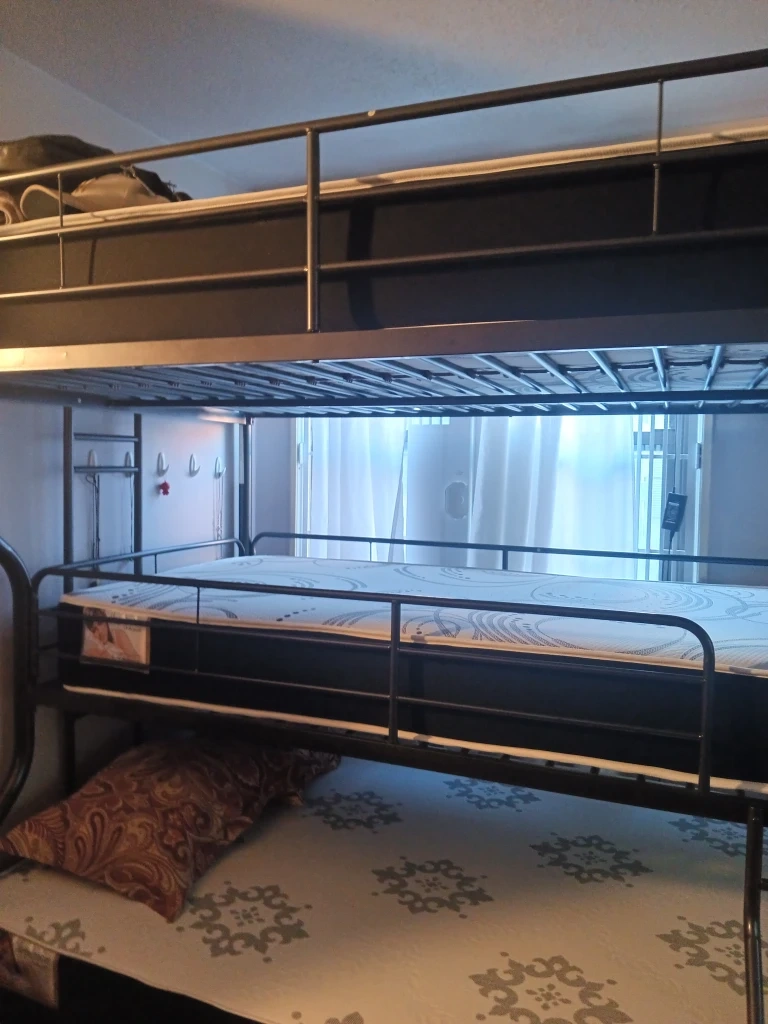 Selling a triple bunk bed frame that comes with mattresses. It's in good condition and ready for a new home! Perfect for kids or anyone needing to maximize space