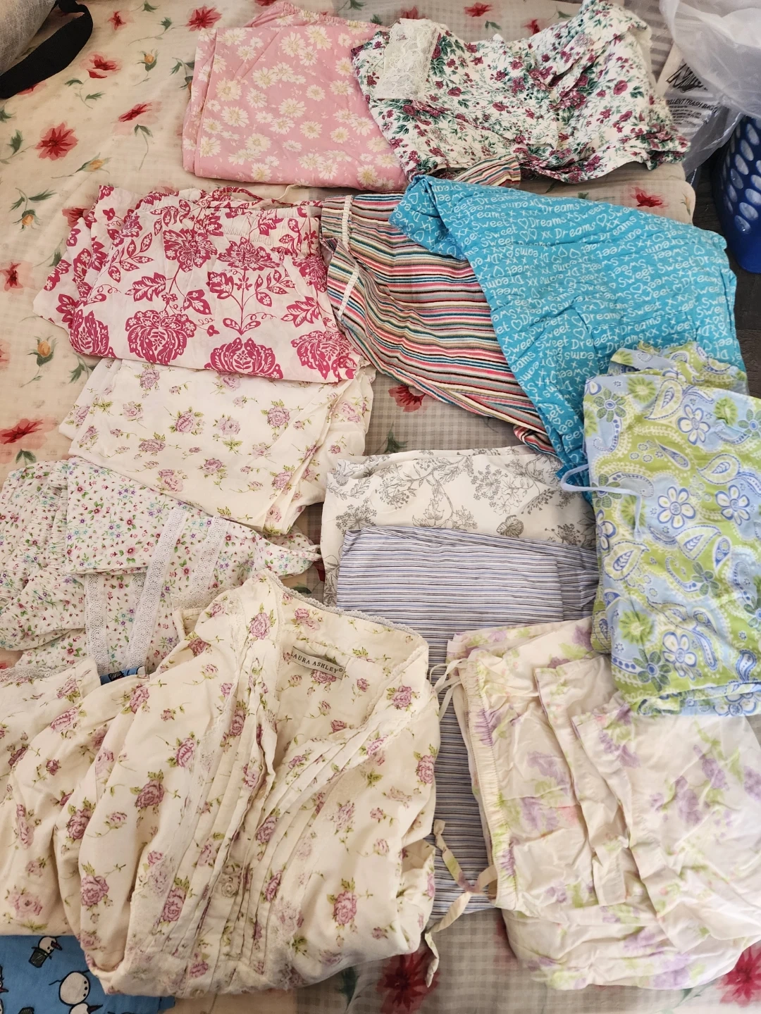 This lot includes two Laura Ashley floral nightgowns. One is a white and pink floral print with lace trim. The other is a cream-colored nightgown with a floral print. Also included are a pair of pink floral pajama bottoms and a blue graphic pajama top.