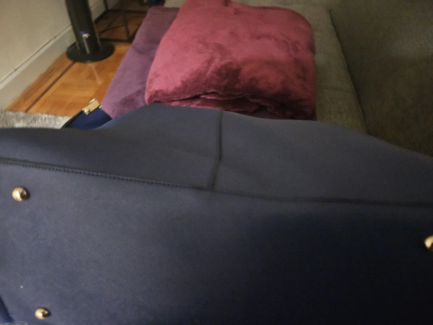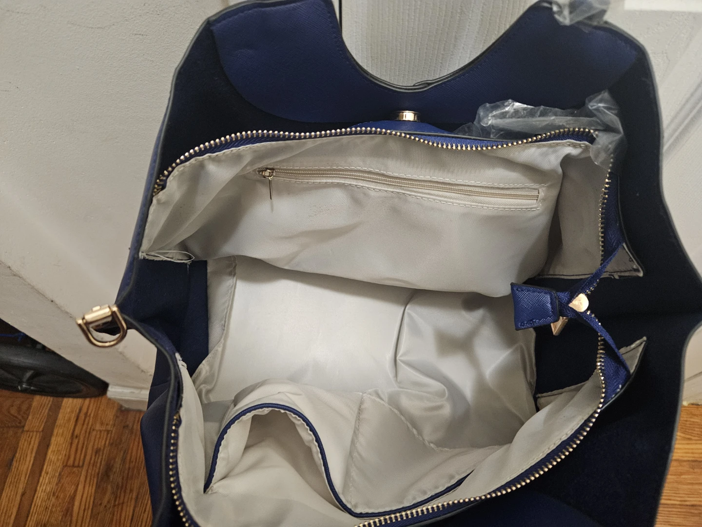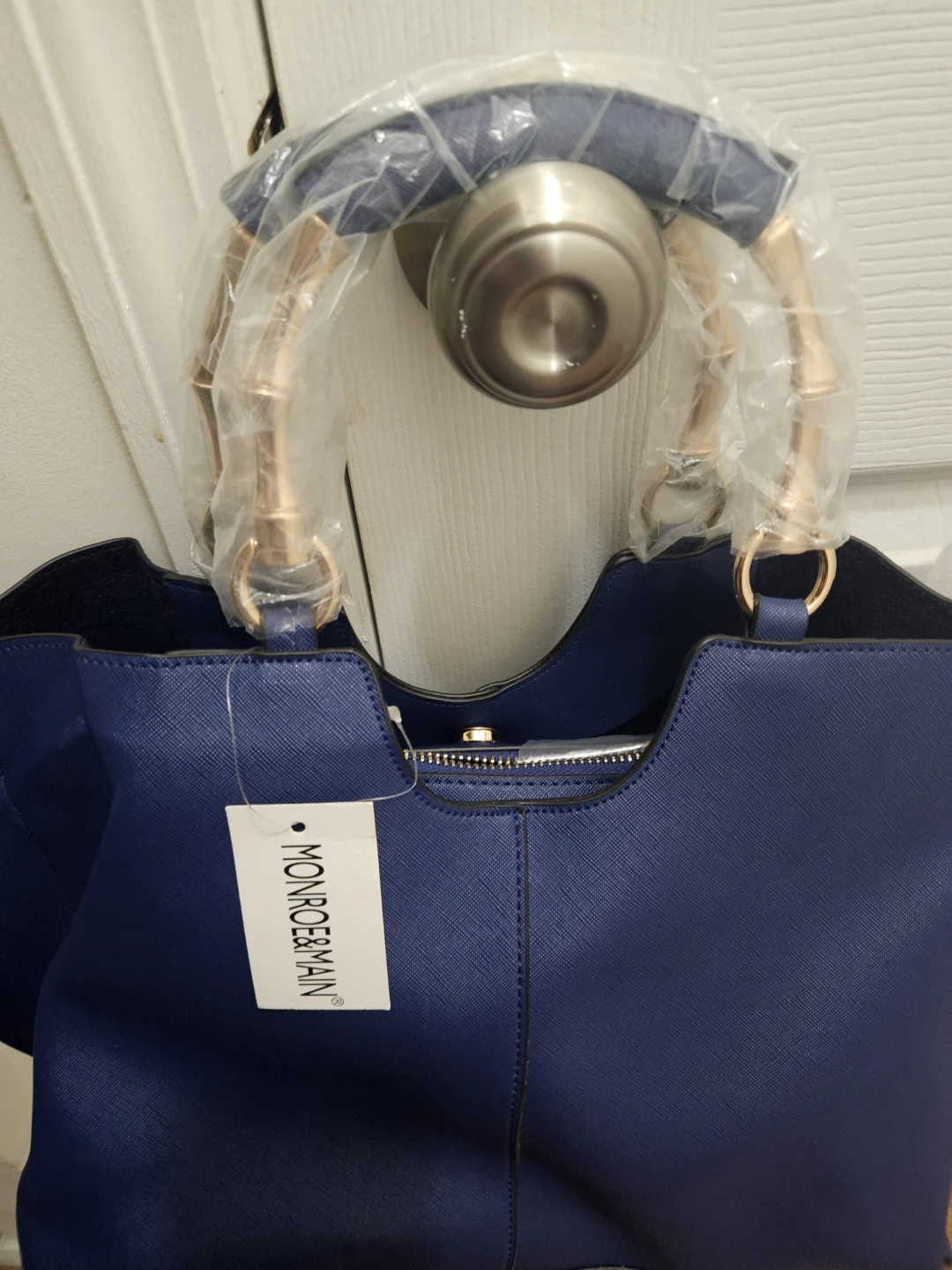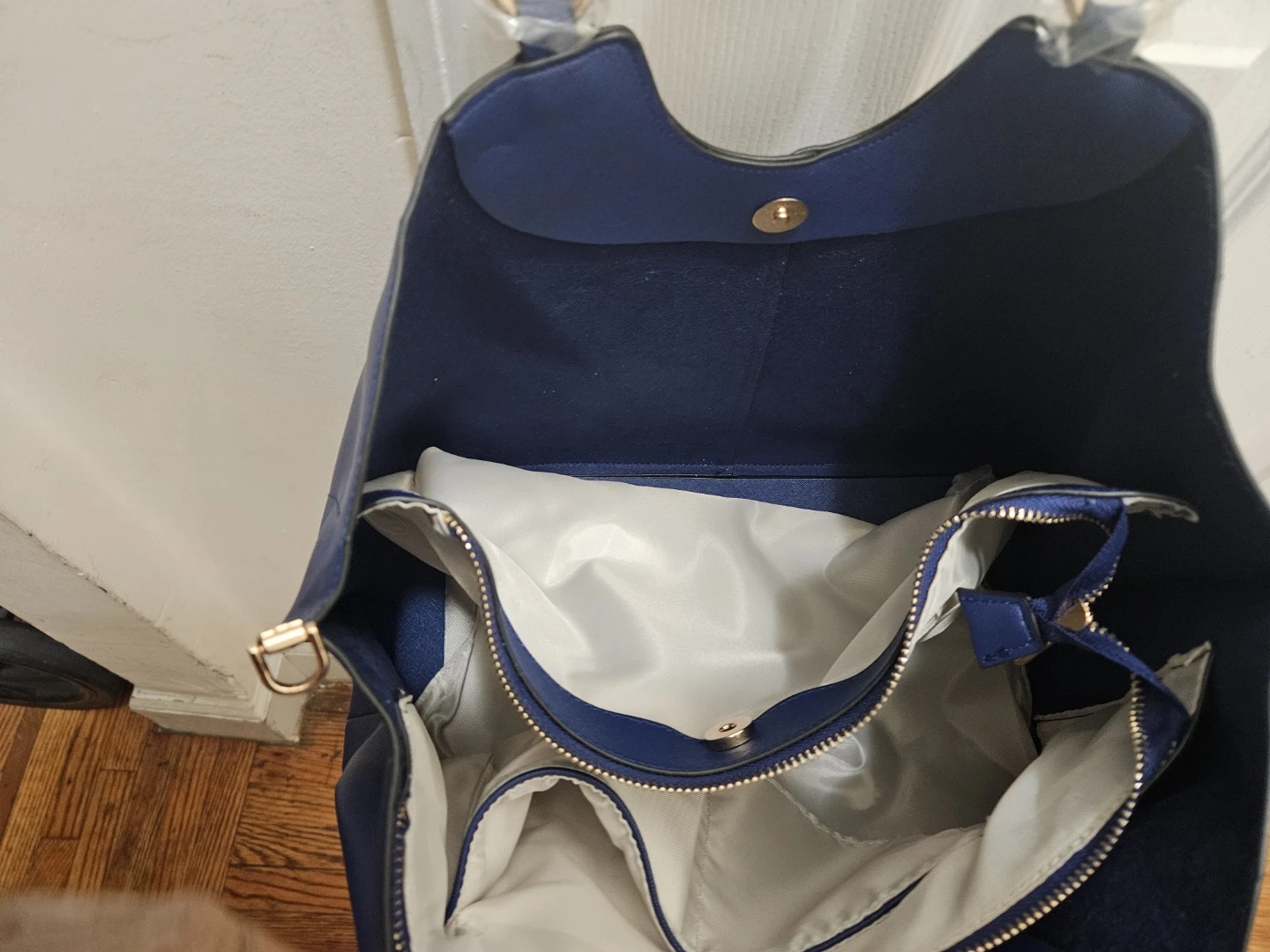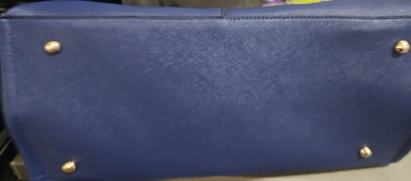 This brand new bag is great for carrying all of your essentials. Can be used as a reusable bag as well. Done in an easy to clean pvc material, the bag features lots of room, with two small pockets and one medium-sized zipper pocket. There are two snap closures, goldtone feet, and two padded gold tone bamboo handles.